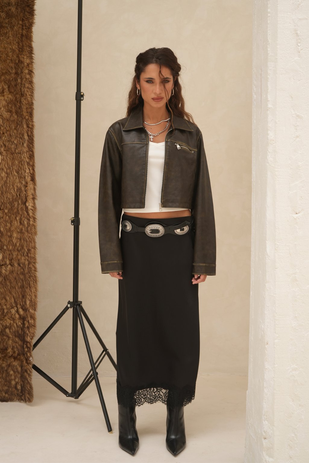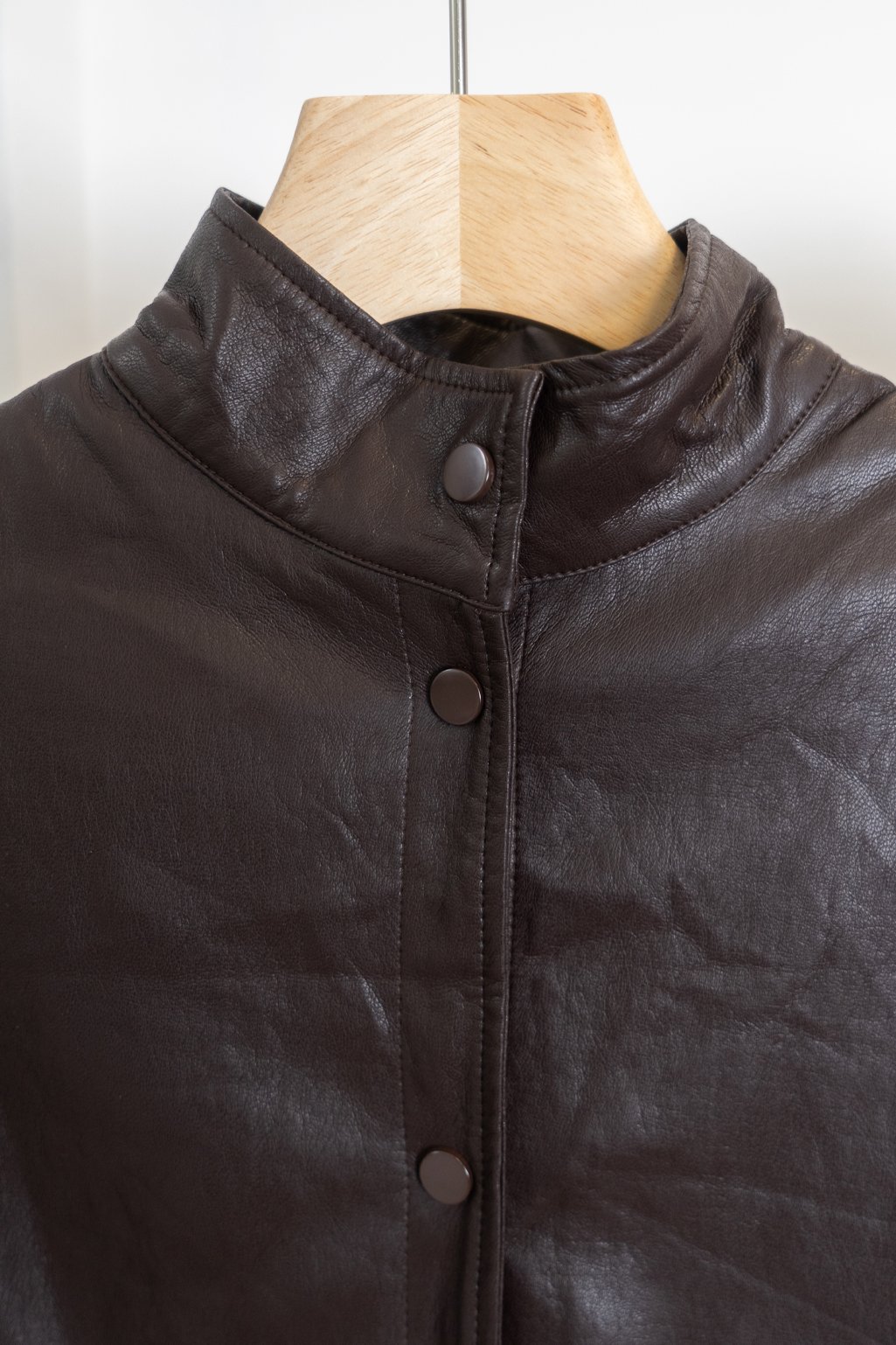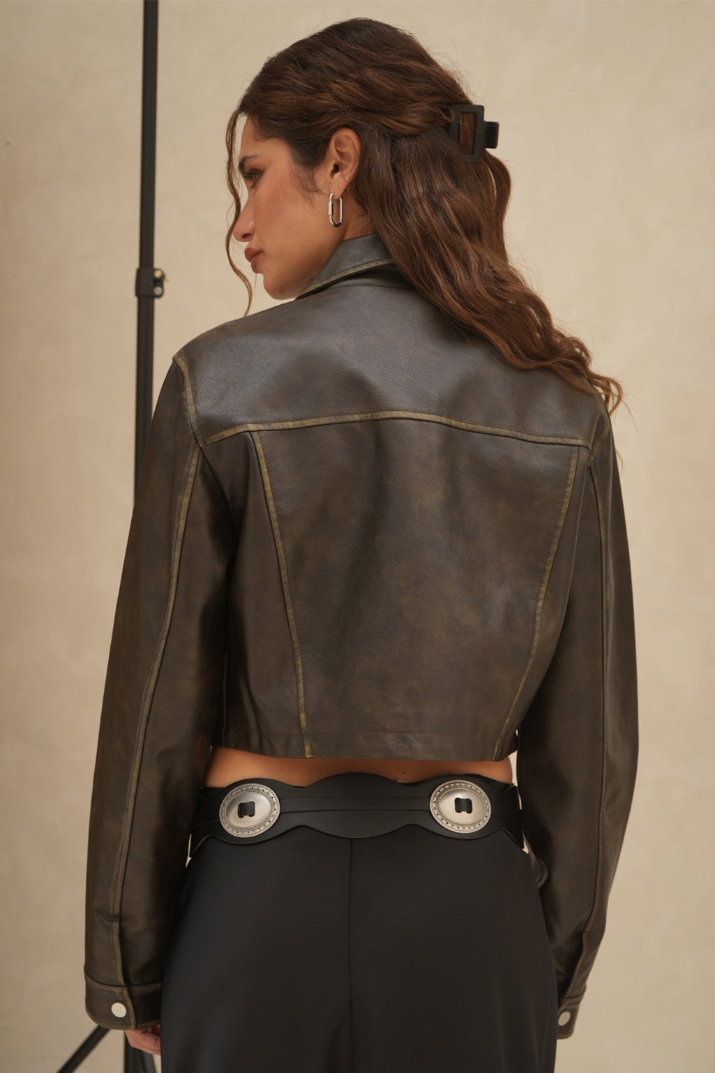 Campera de cuero estilo bomber, con botones y leve relleno que aporta estructura y abrigo. De calidad premium y terminaciones impecables. Disponible en talle S y M.