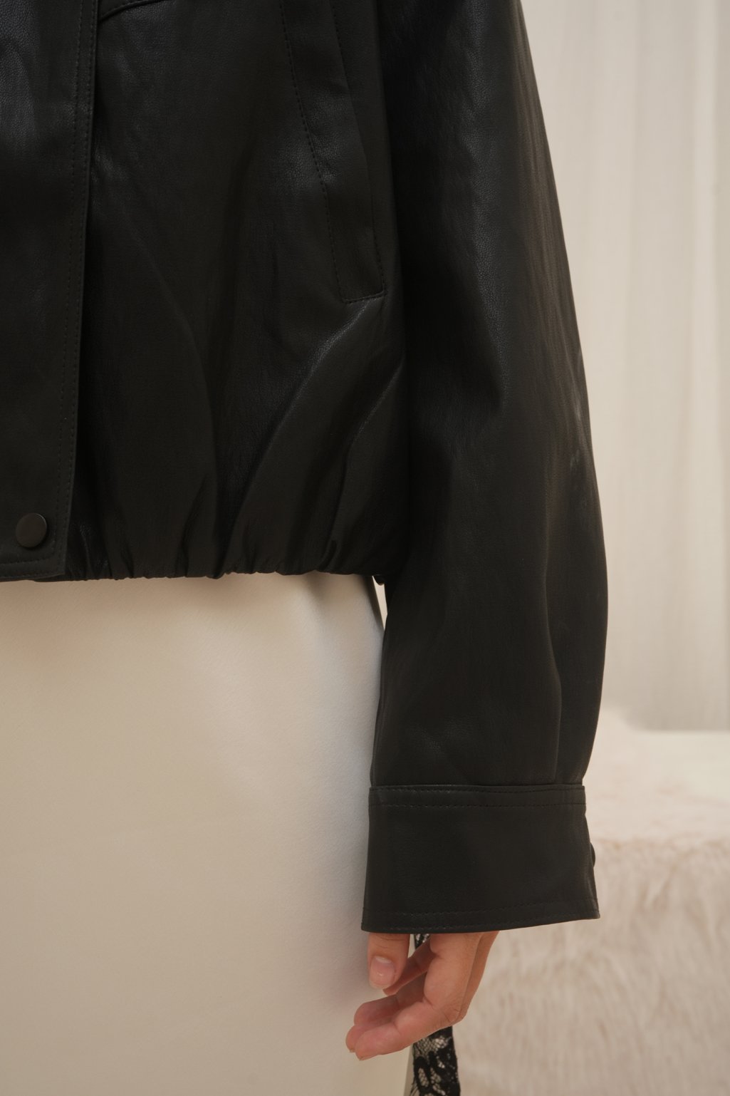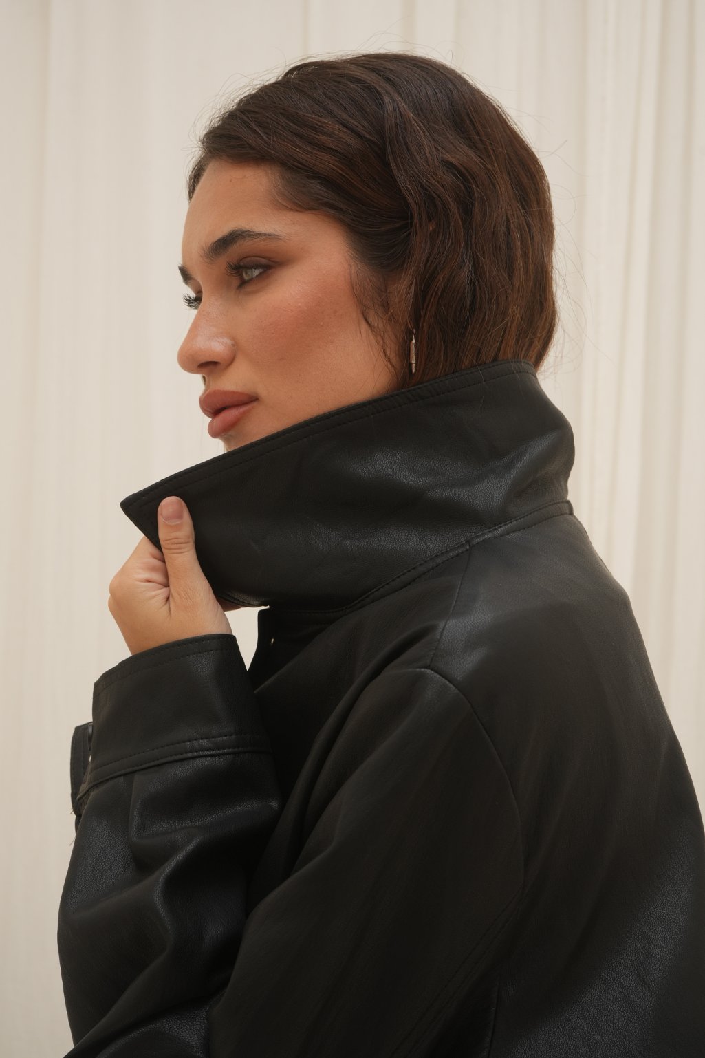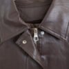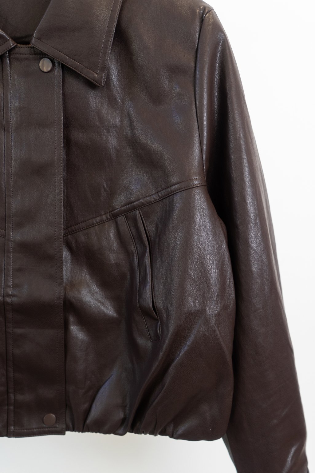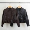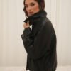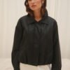 Campera de cuero estilo bomber, con un diseño moderno y súper canchero. Tiene cuello amplio, botones en el frente y un leve frunce en la parte inferior que le da un calce muy lindo. No tiene relleno.
