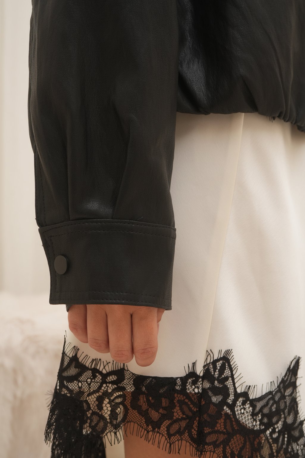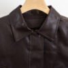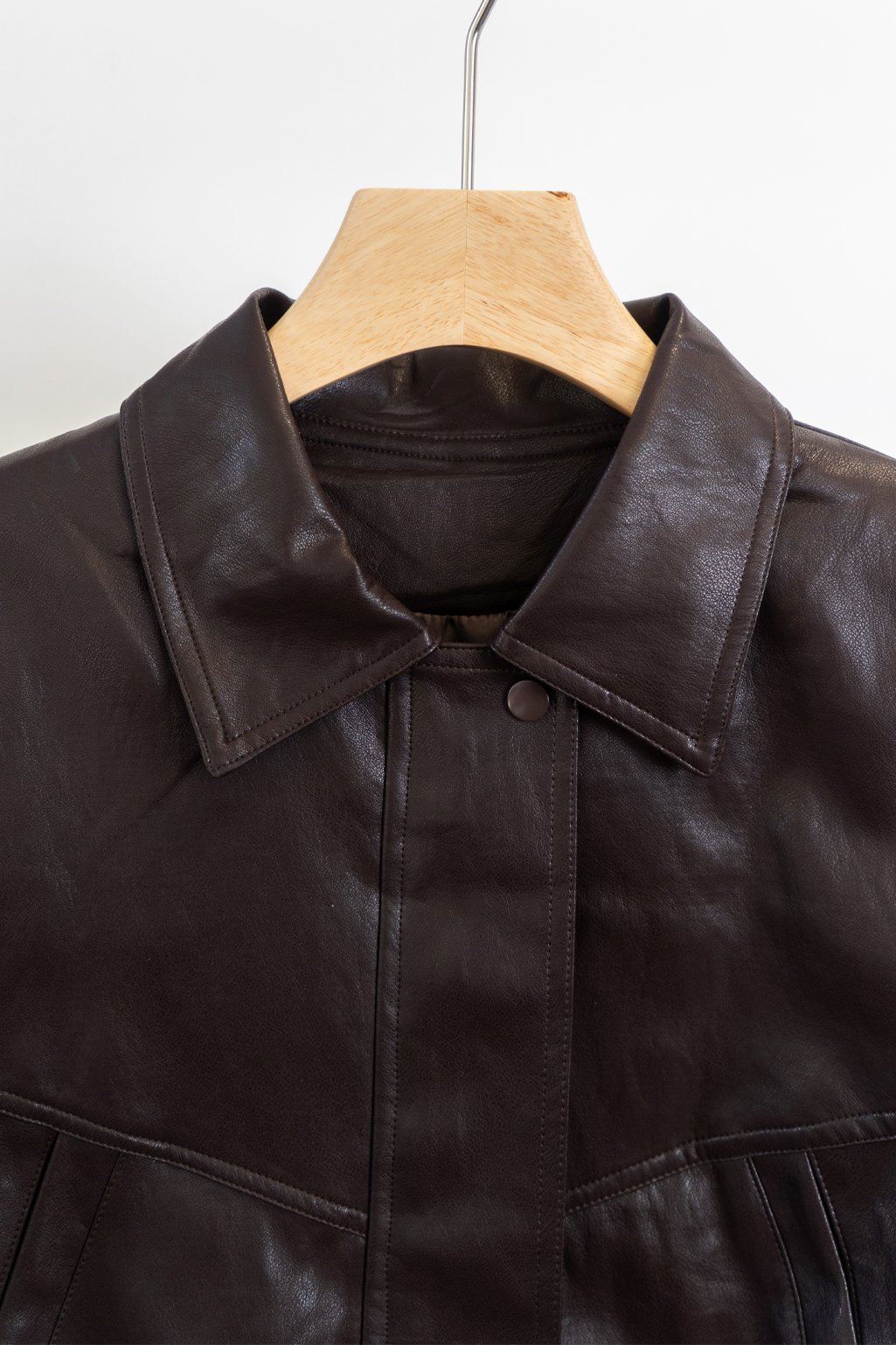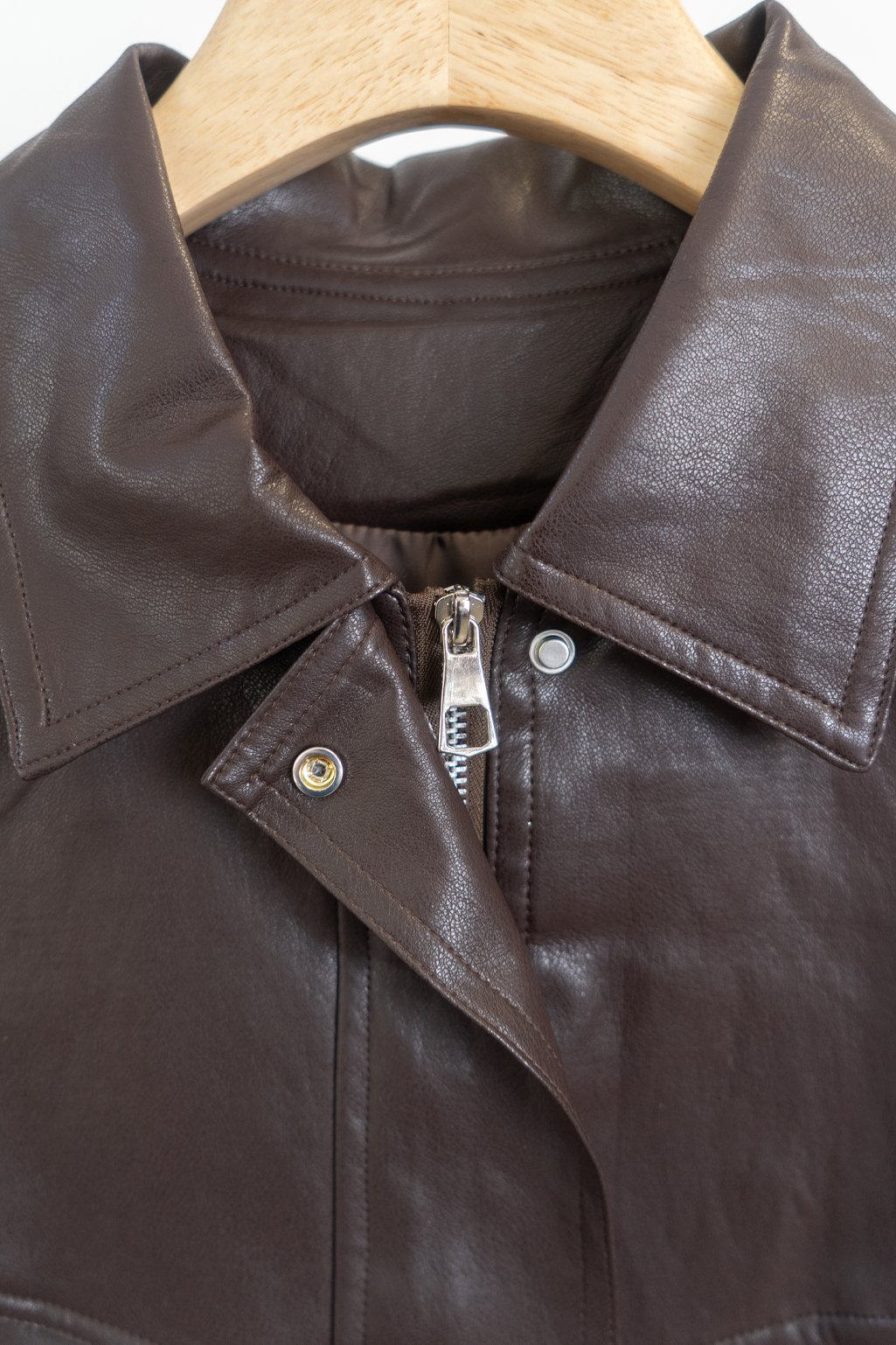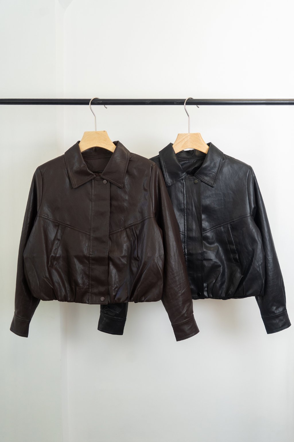 Campera de cuero estilo bomber, con un diseño moderno y súper canchero. Tiene cuello amplio, botones en el frente y un leve frunce en la parte inferior que le da un calce muy lindo. No tiene relleno.