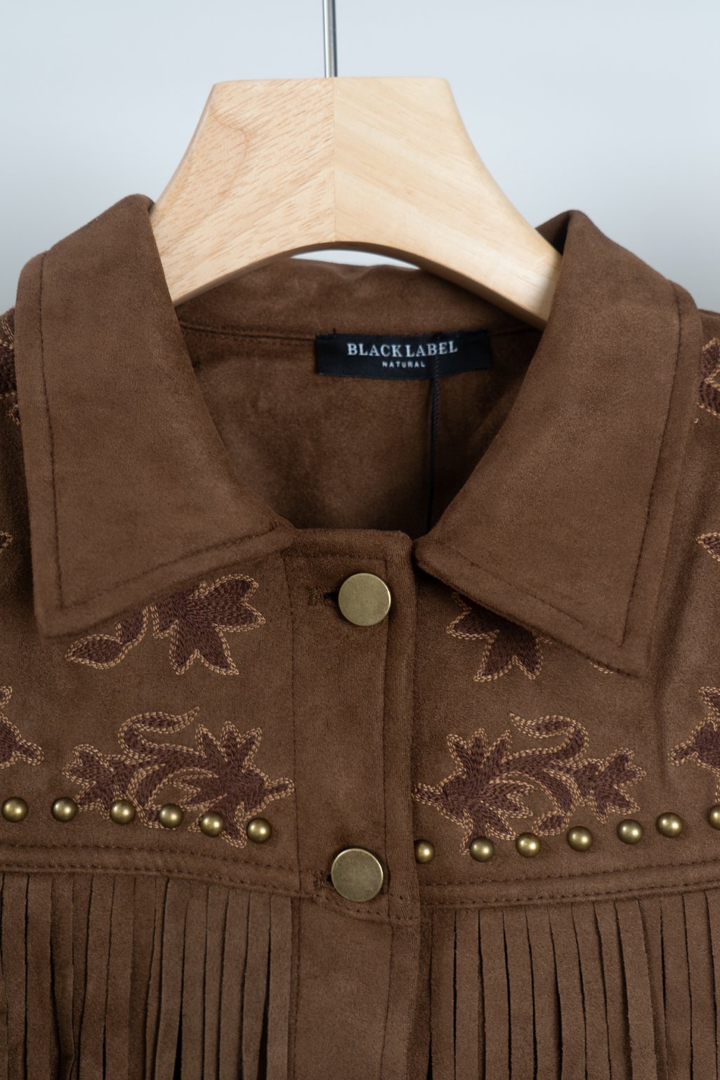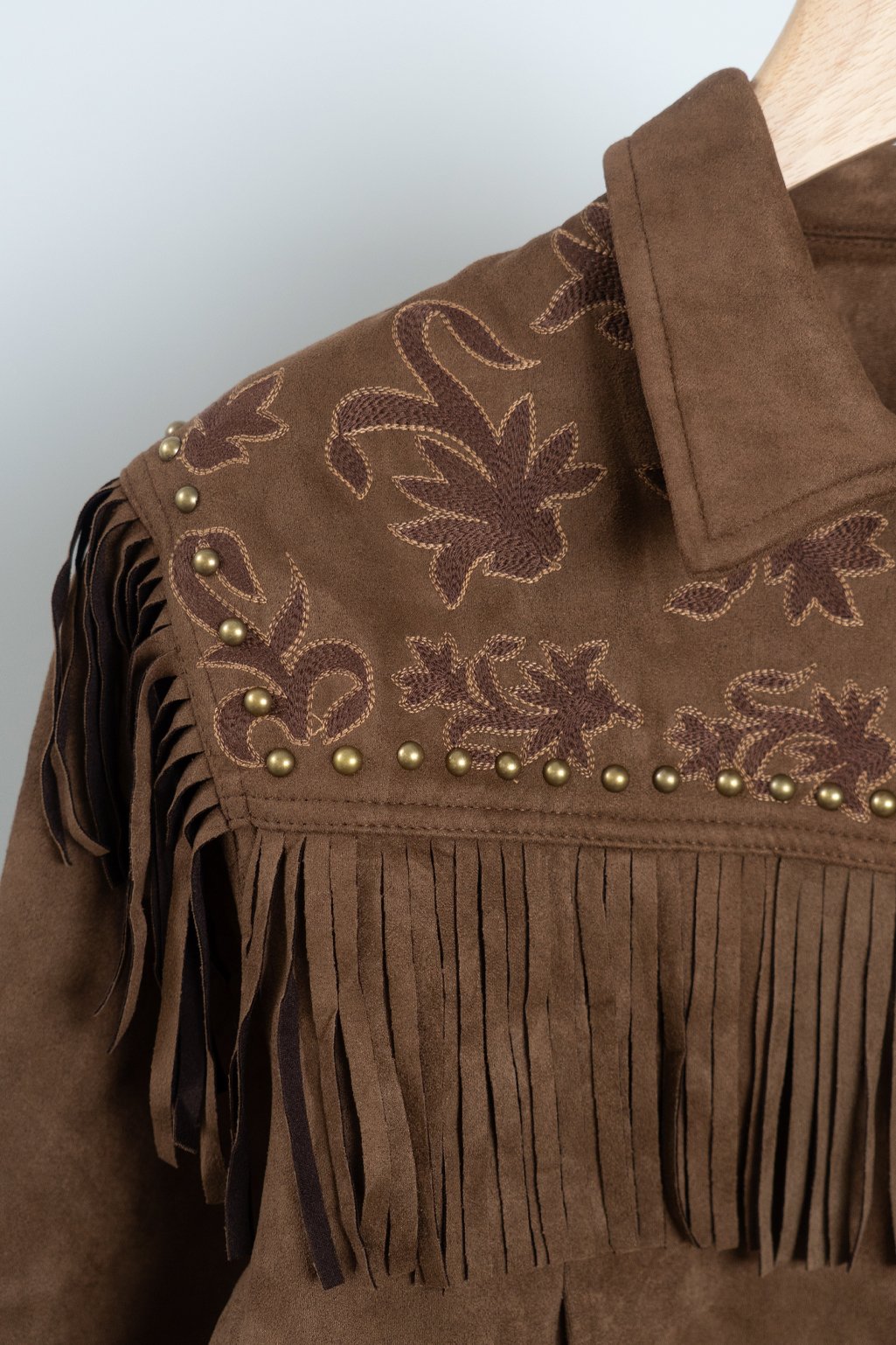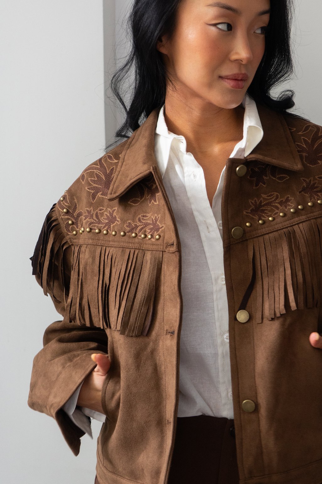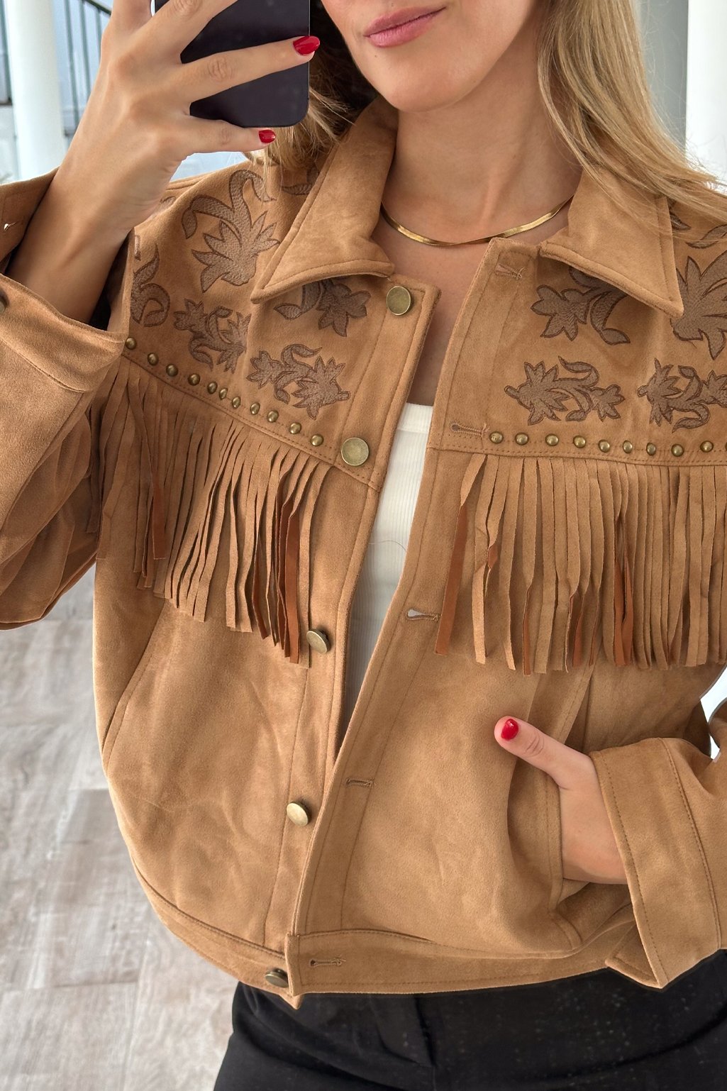 Campera de gamuza con flecos y bordado, de estilo boho chic. Un modelo con mucho carácter y detalles que la hacen única. Ideal para levantar cualquier look.