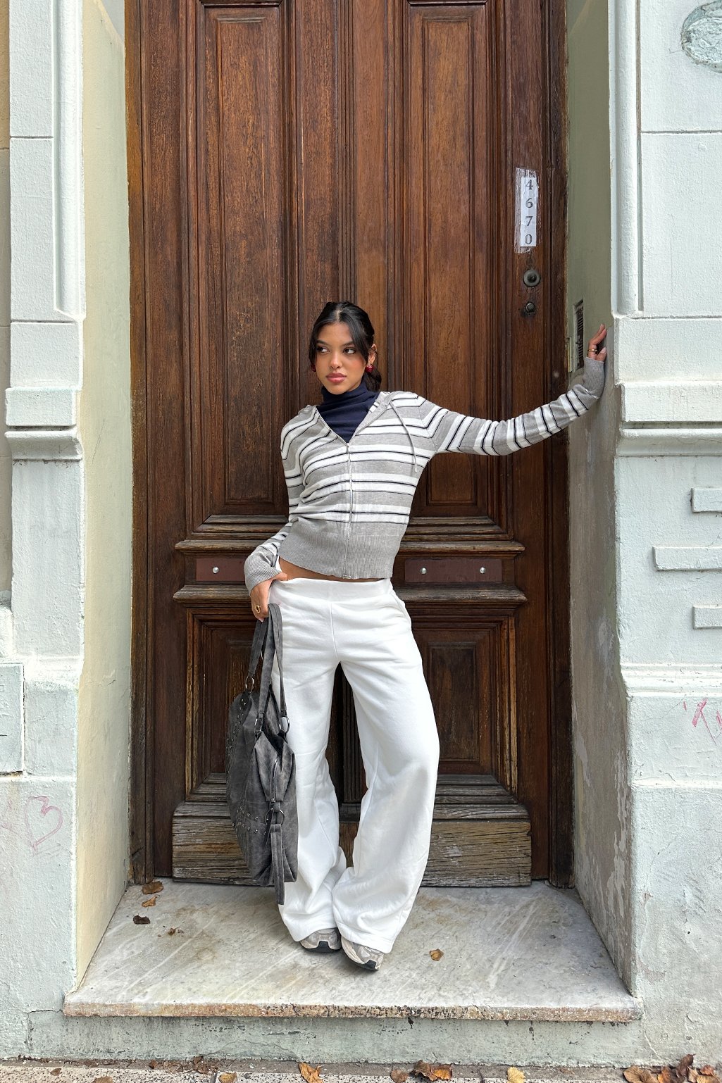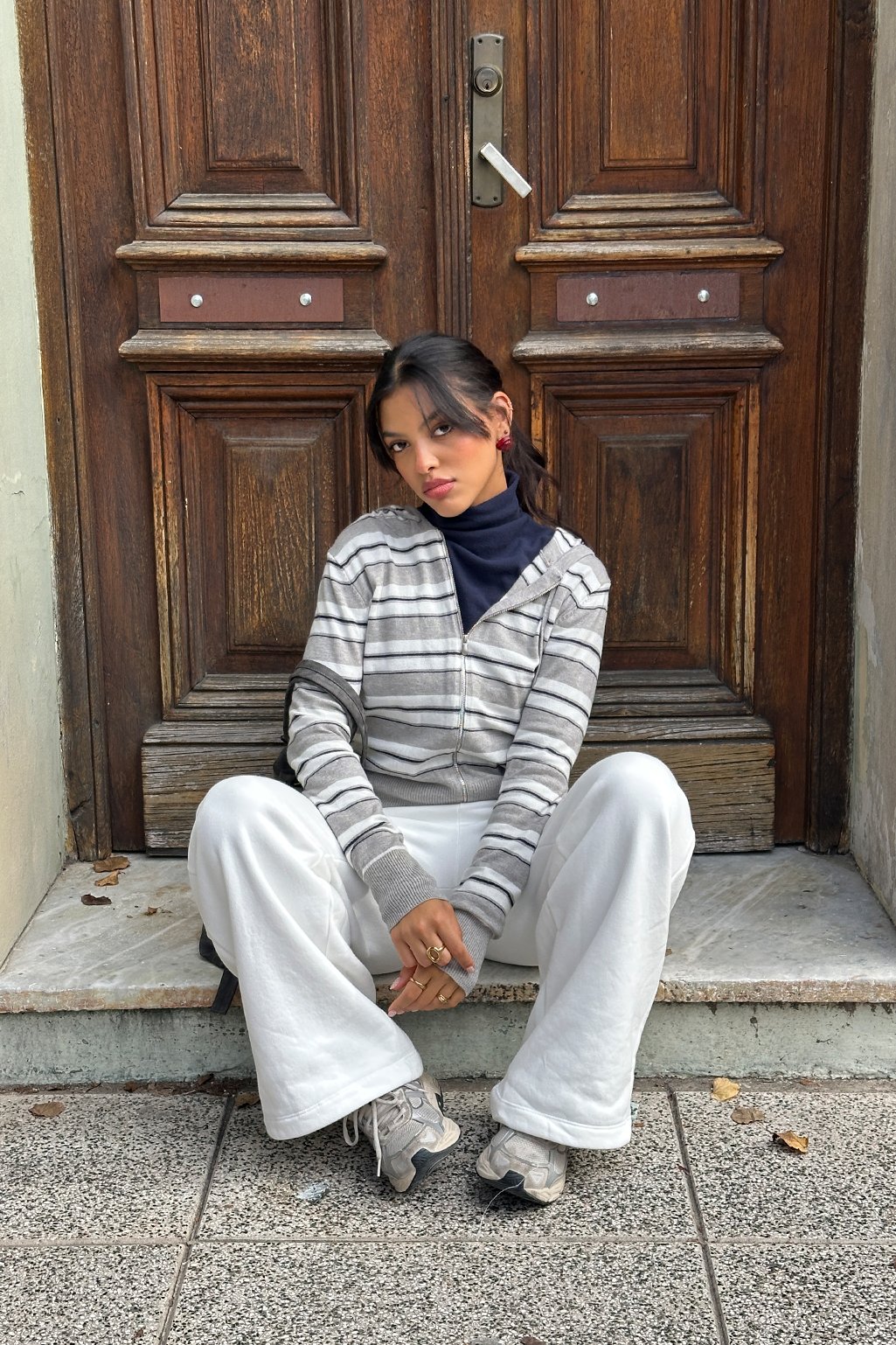 Campera tejida rayada con capucha y cierre doble camino. La estampa en tendencia de esta temporada en una prenda súper versatil y cómoda! 🙂 Talle único.