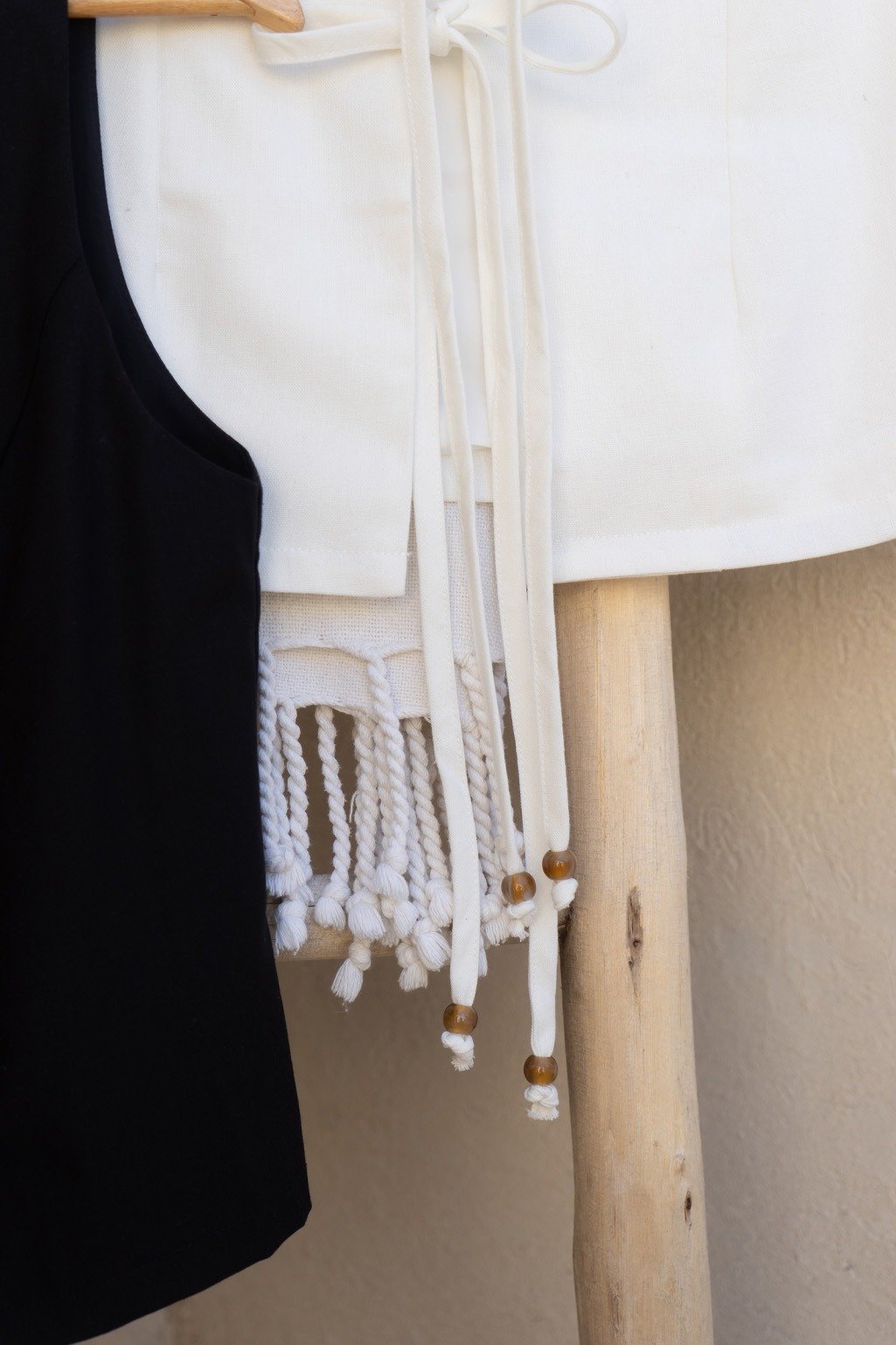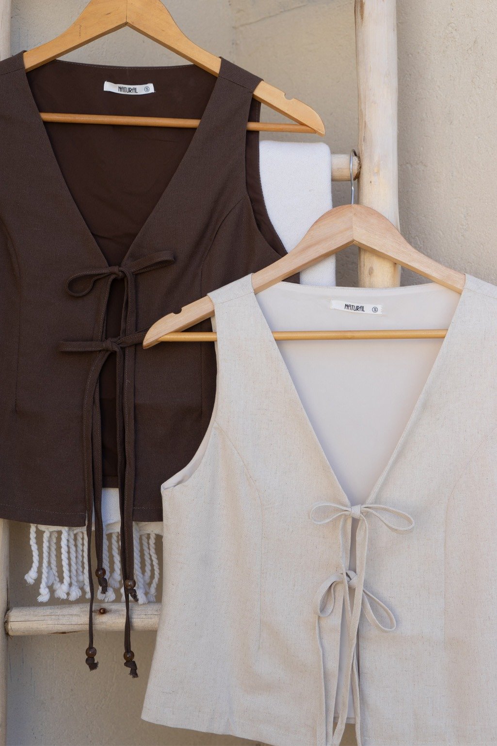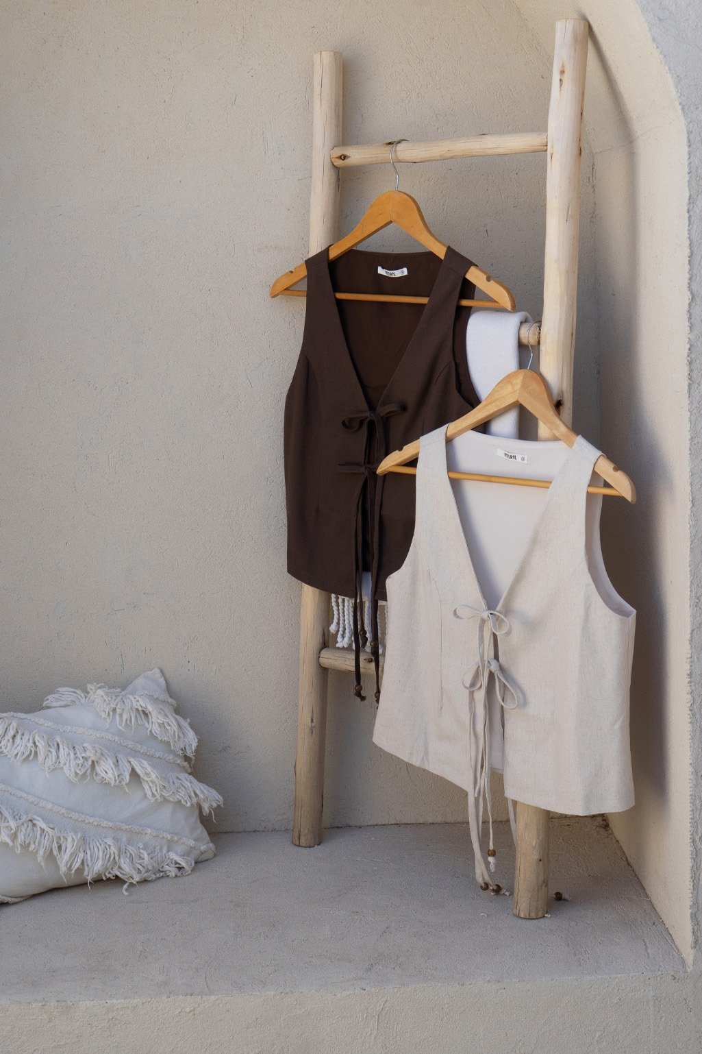 Chaleco de lino forrado a tono. En el frente tiene lazos con terminación en mostacillas color carey, se puede usar abierto o cerrado, como más te guste 🙂 Tiene pinzas para un calce perfecto. Disponible en talle S y M, medidas en la última imagen.