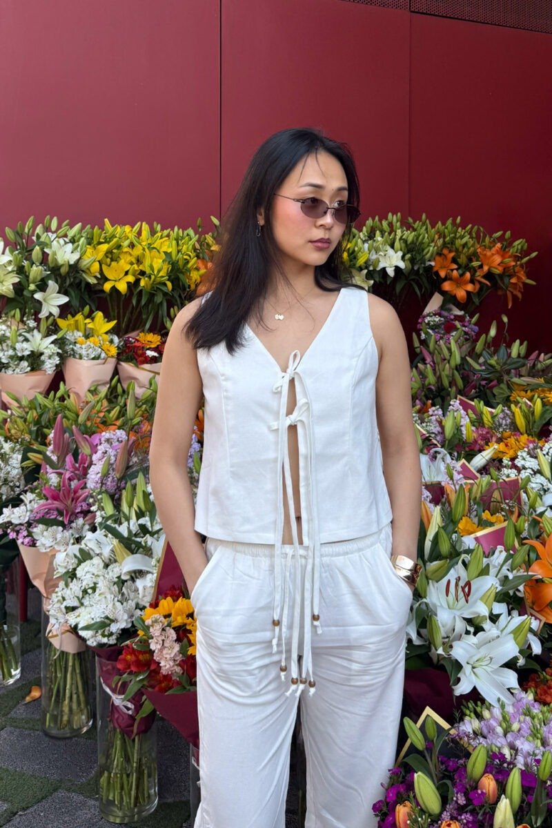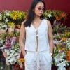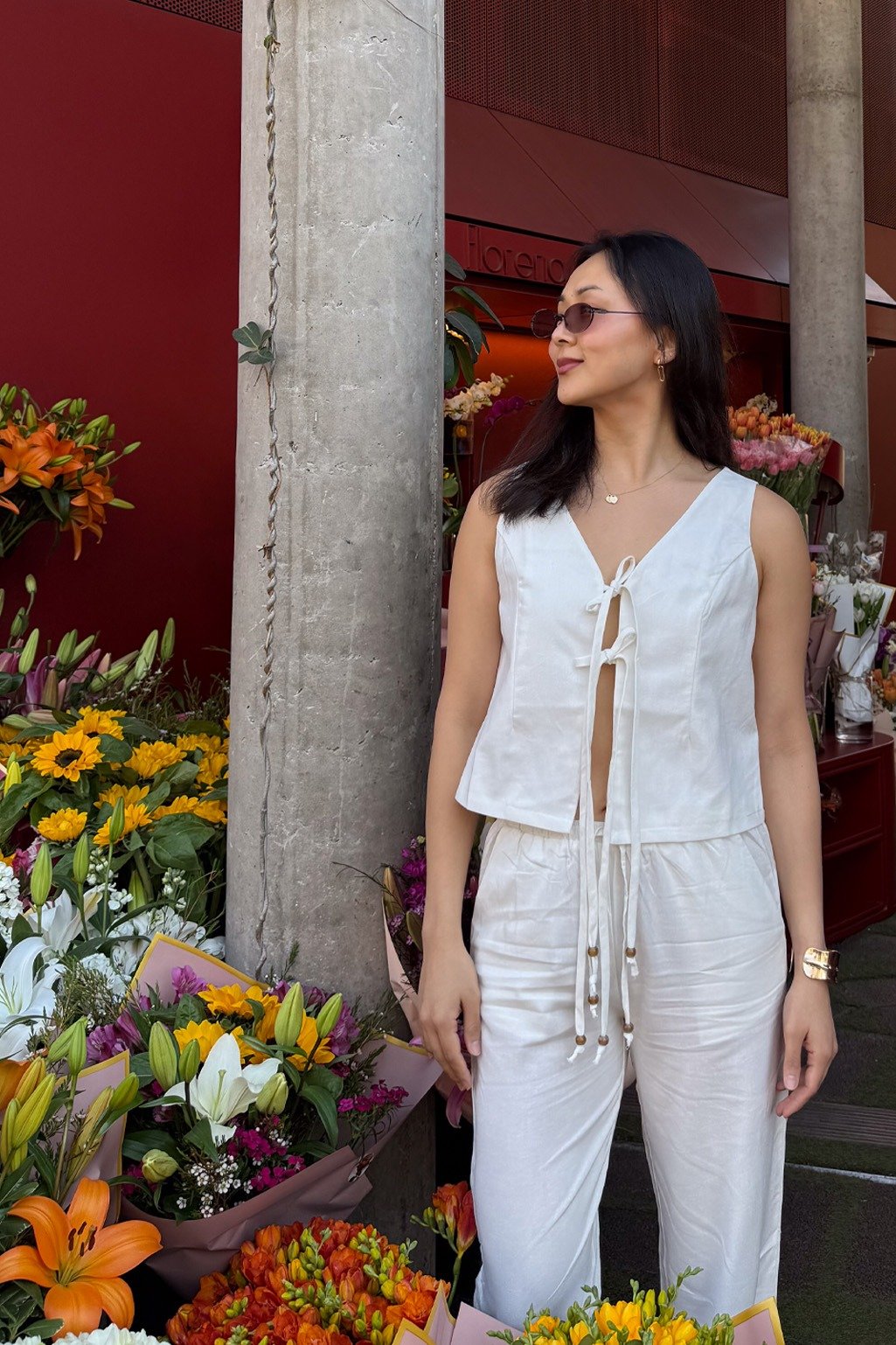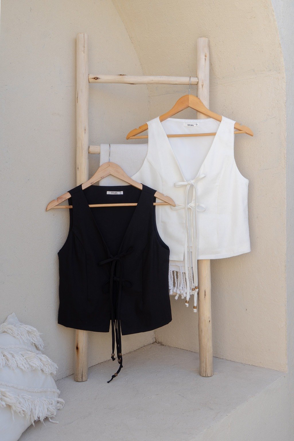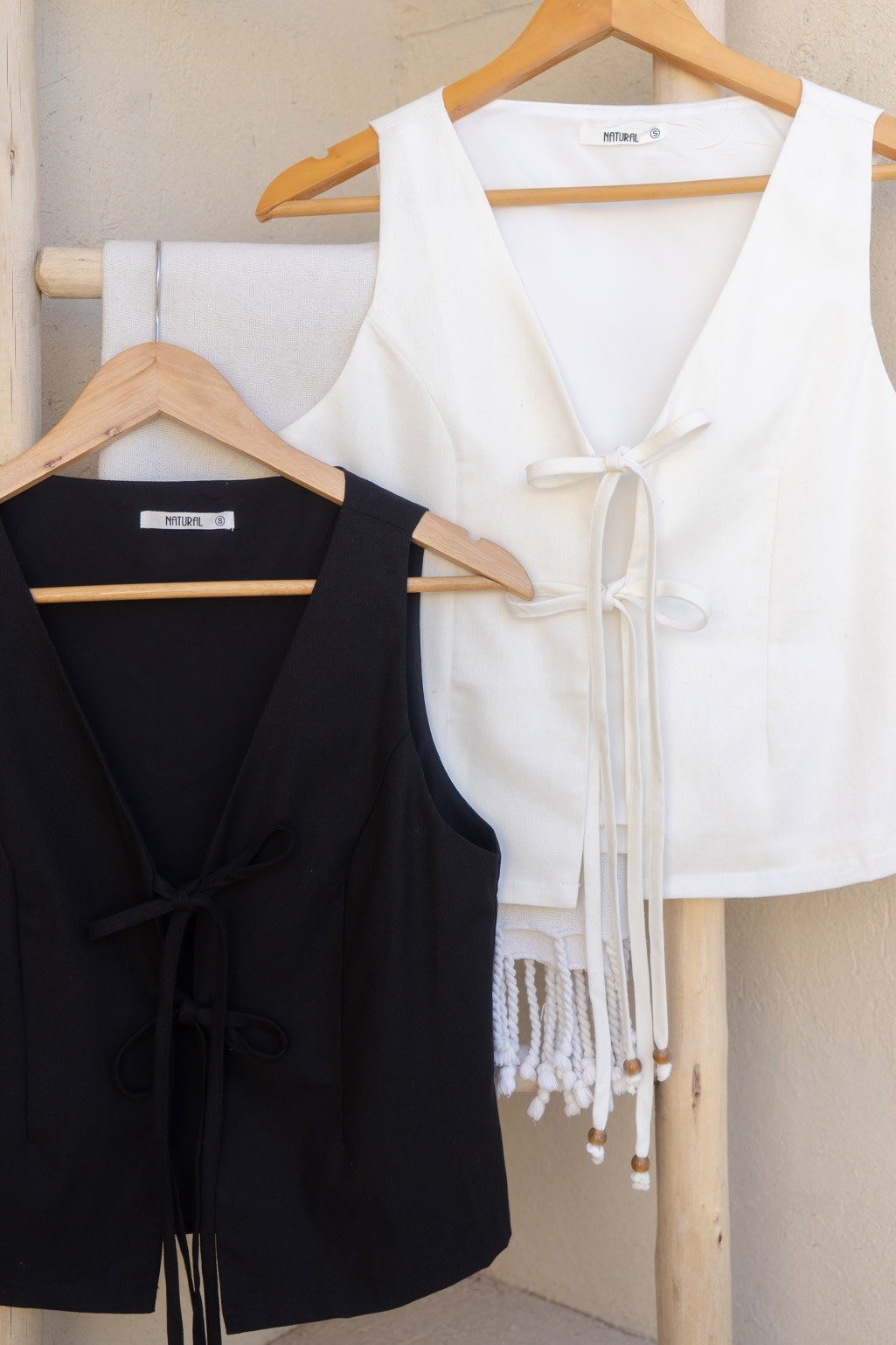 Chaleco de lino forrado a tono. En el frente tiene lazos con terminación en mostacillas color carey, se puede usar abierto o cerrado, como más te guste 🙂 Tiene pinzas para un calce perfecto. Disponible en talle S y M, medidas en la última imagen.