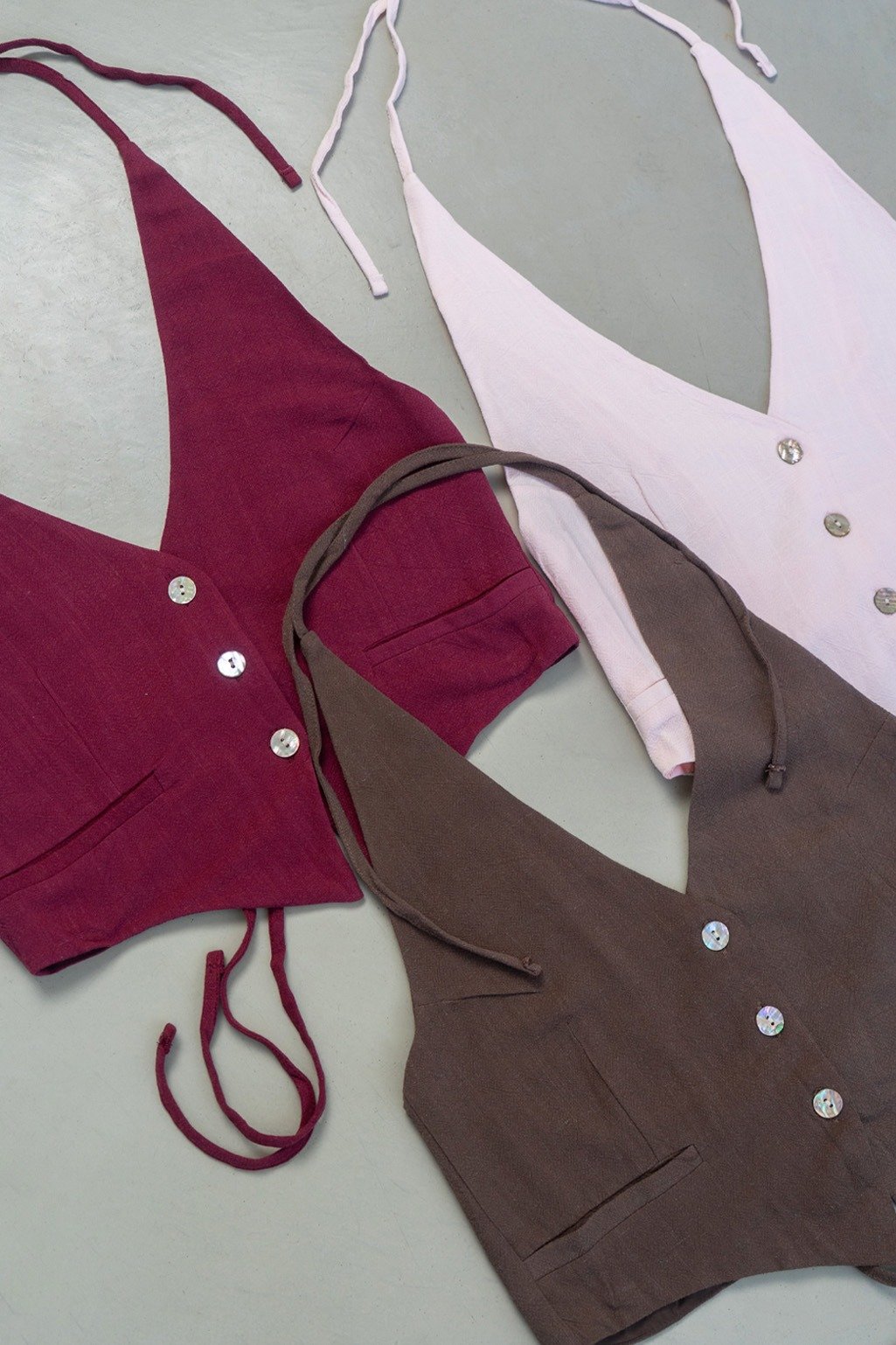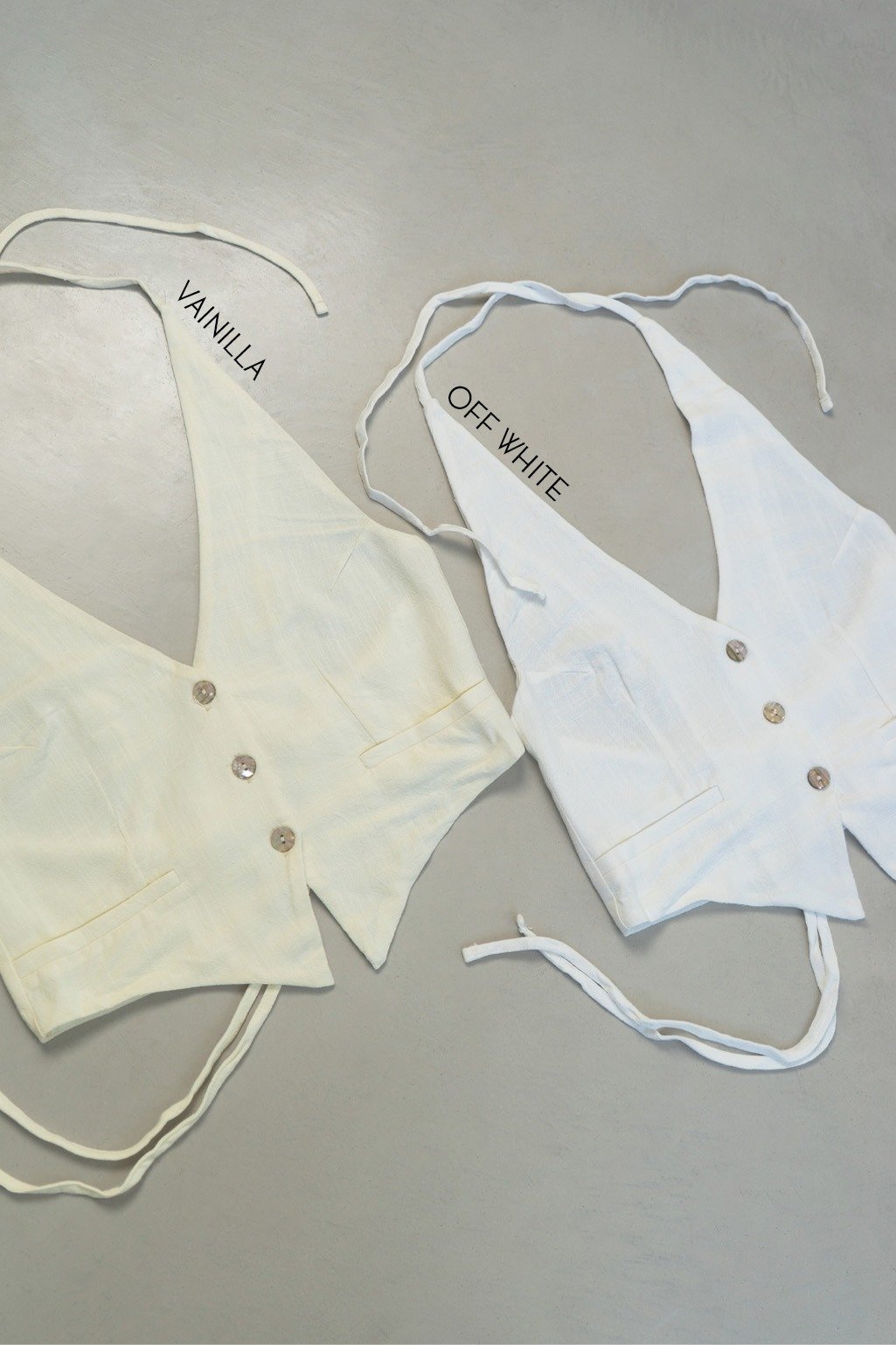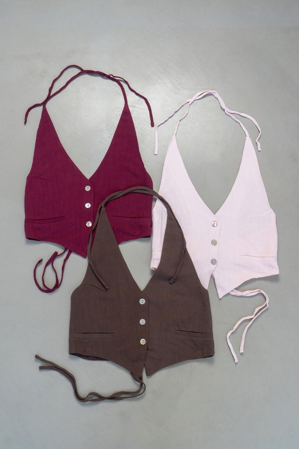 Chaleco estilo sastrero, con tiras para atar en el cuello y espalda, con forrería a tono. Tiene escote en V y botones de nacar, súper delicados ✨ Pinza de busto en el delantero para un calce perfecto. Disponible en talle S y M, medidas en la última imagen.