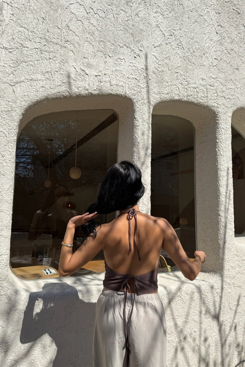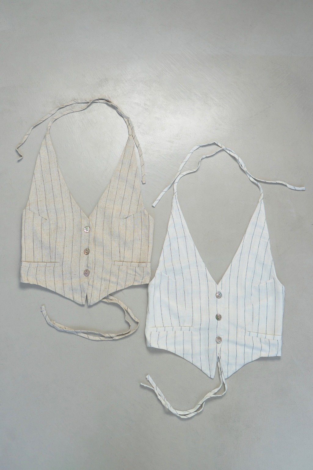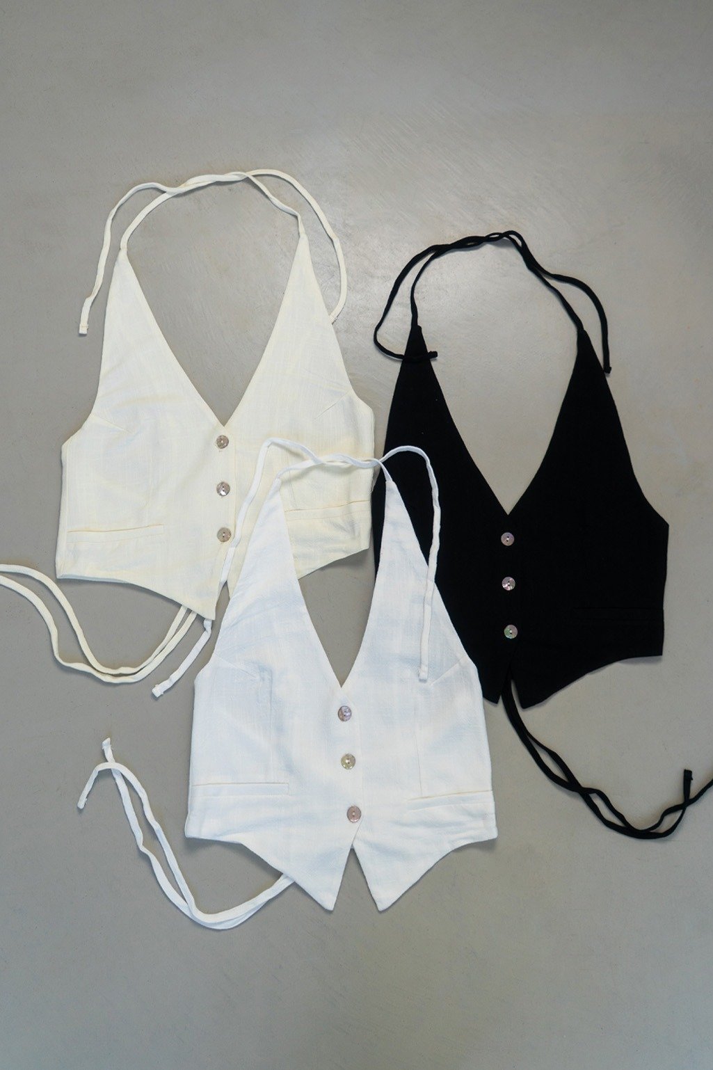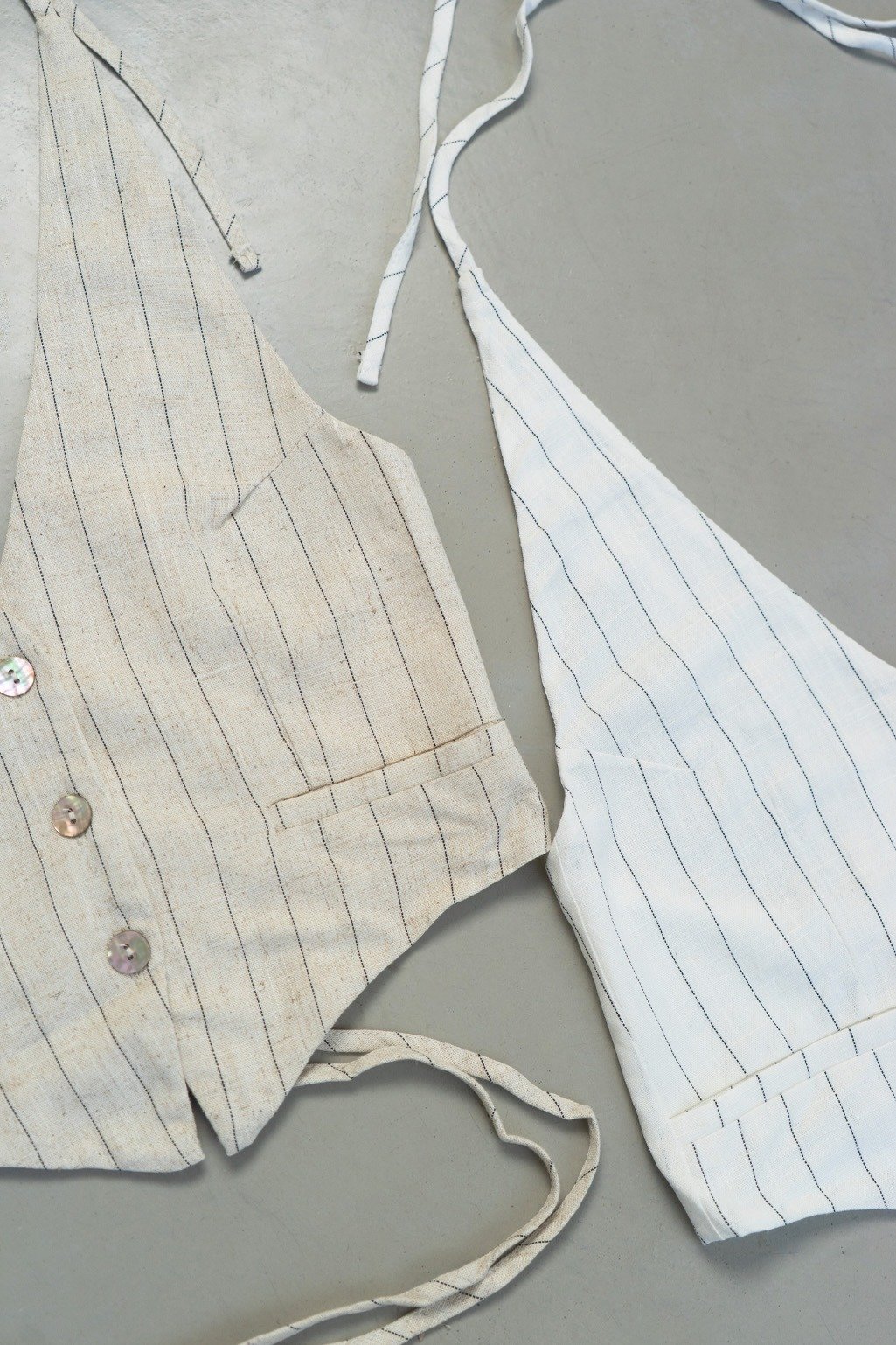 Chaleco estilo sastrero, con tiras para atar en el cuello y espalda, con forrería a tono. Tiene escote en V y botones de nacar, súper delicados ✨ Pinza de busto en el delantero para un calce perfecto. Disponible en talle S y M, medidas en la última imagen.