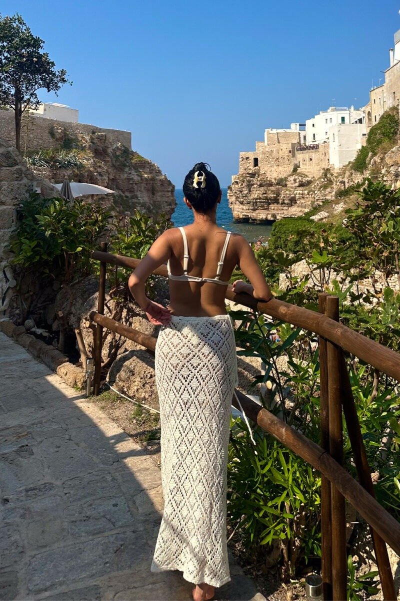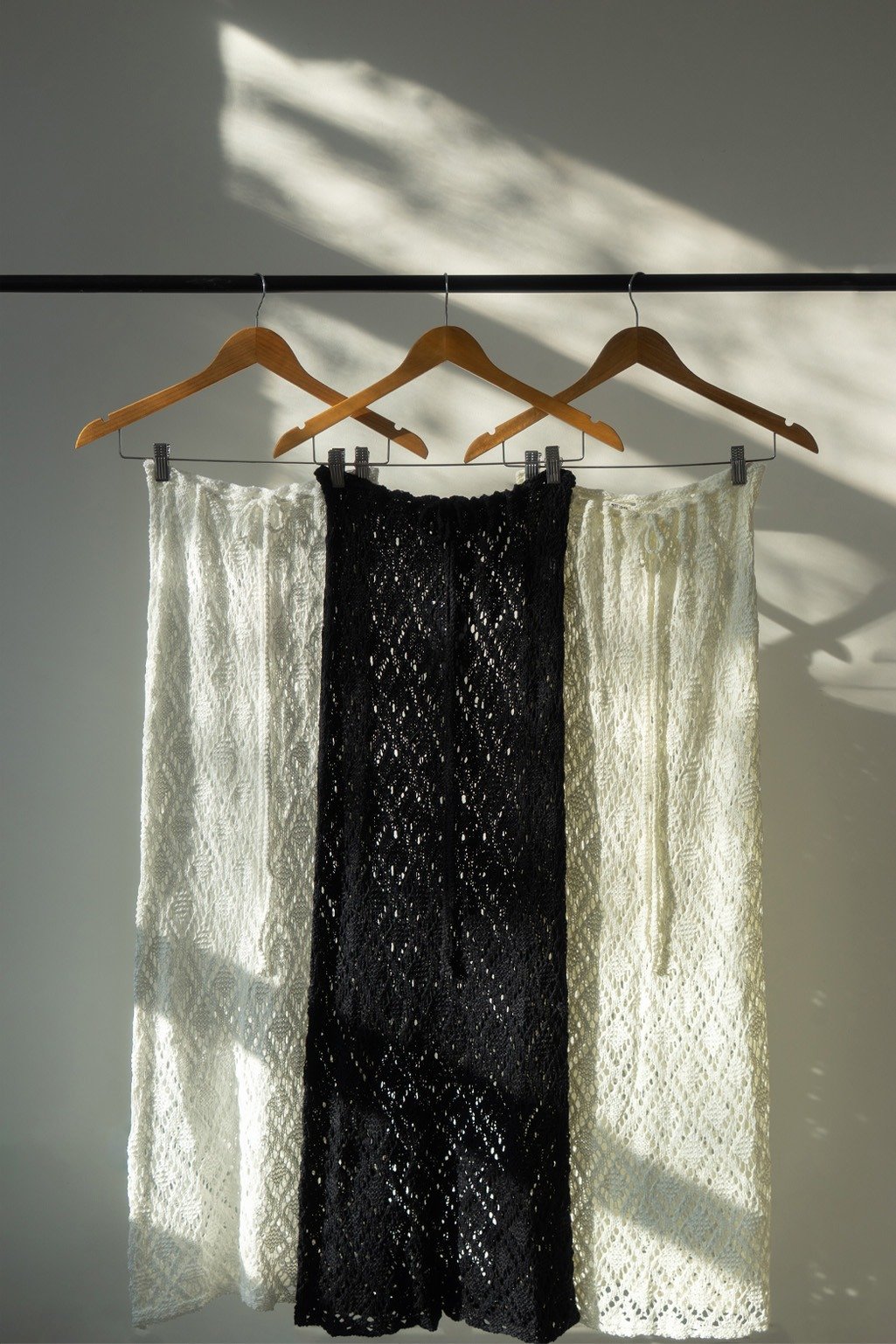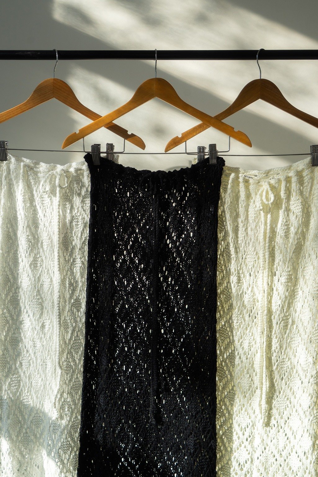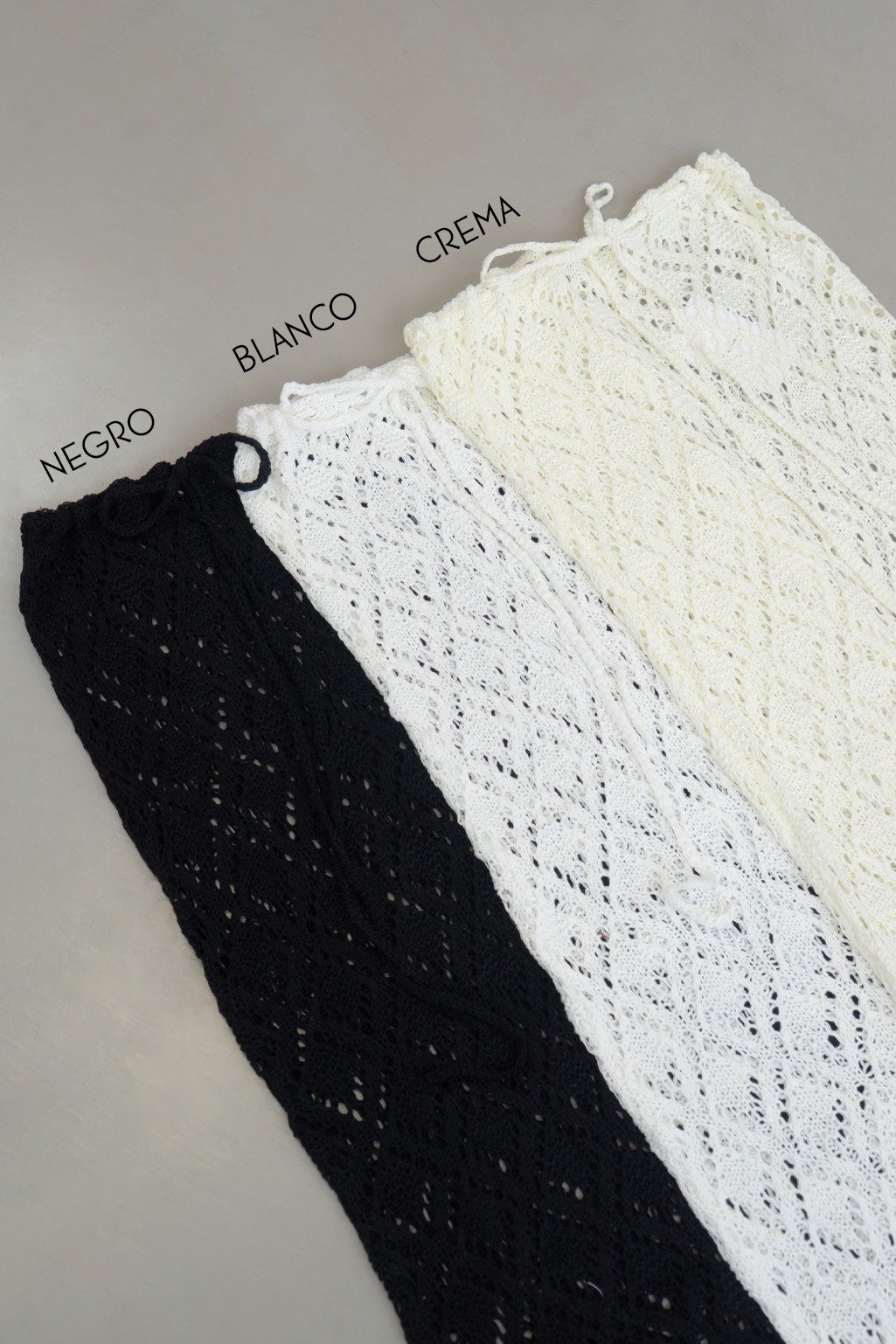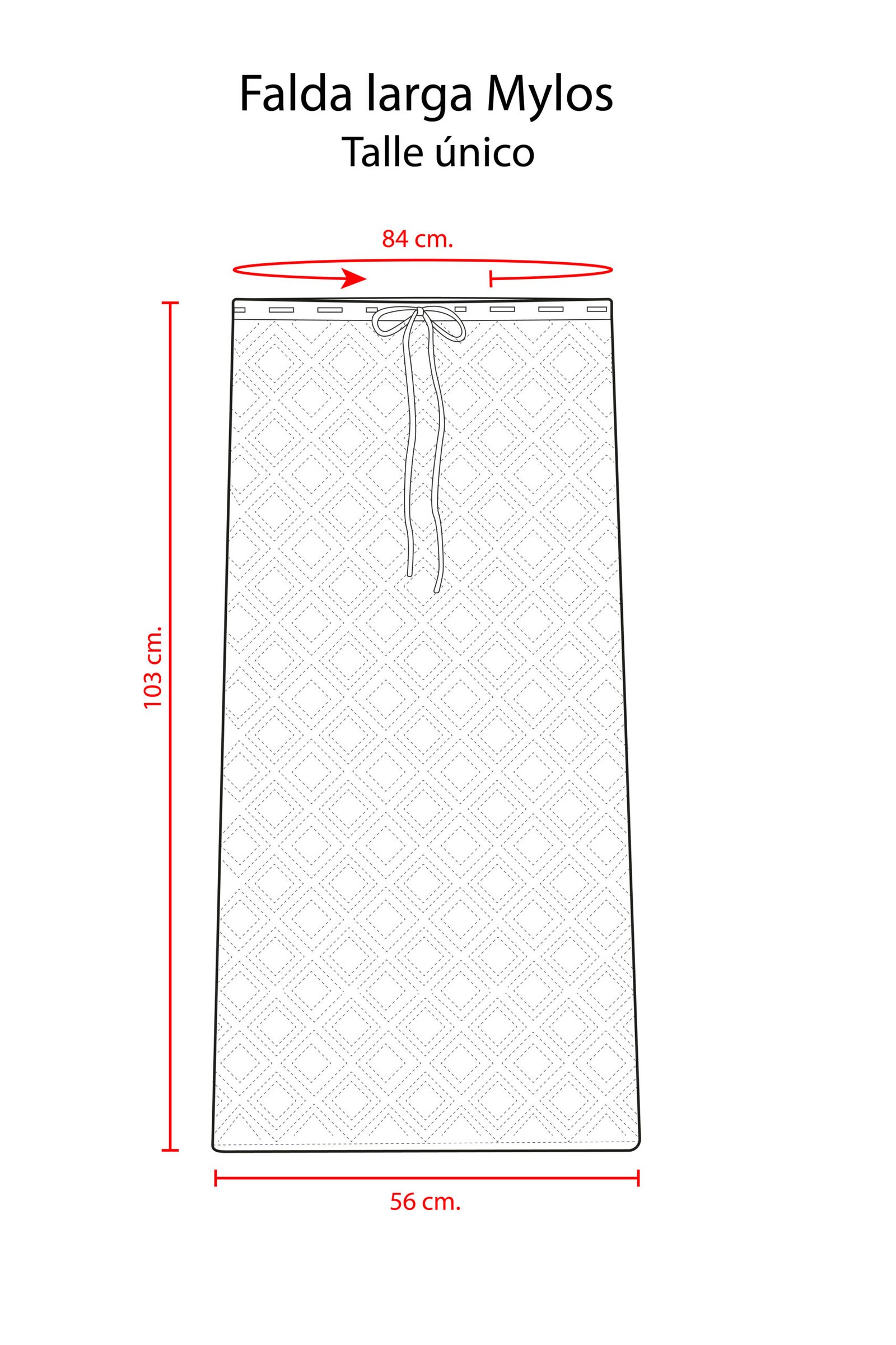 Falda larga tejida a crochet con una trama compleja y original. En la cintura tiene un cordón tejido para que la puedas ajustar como vos quieras Medidas en la última imagen.