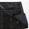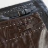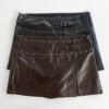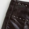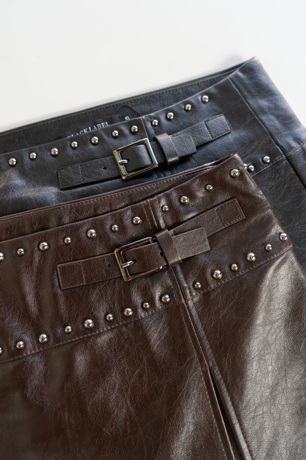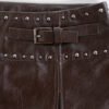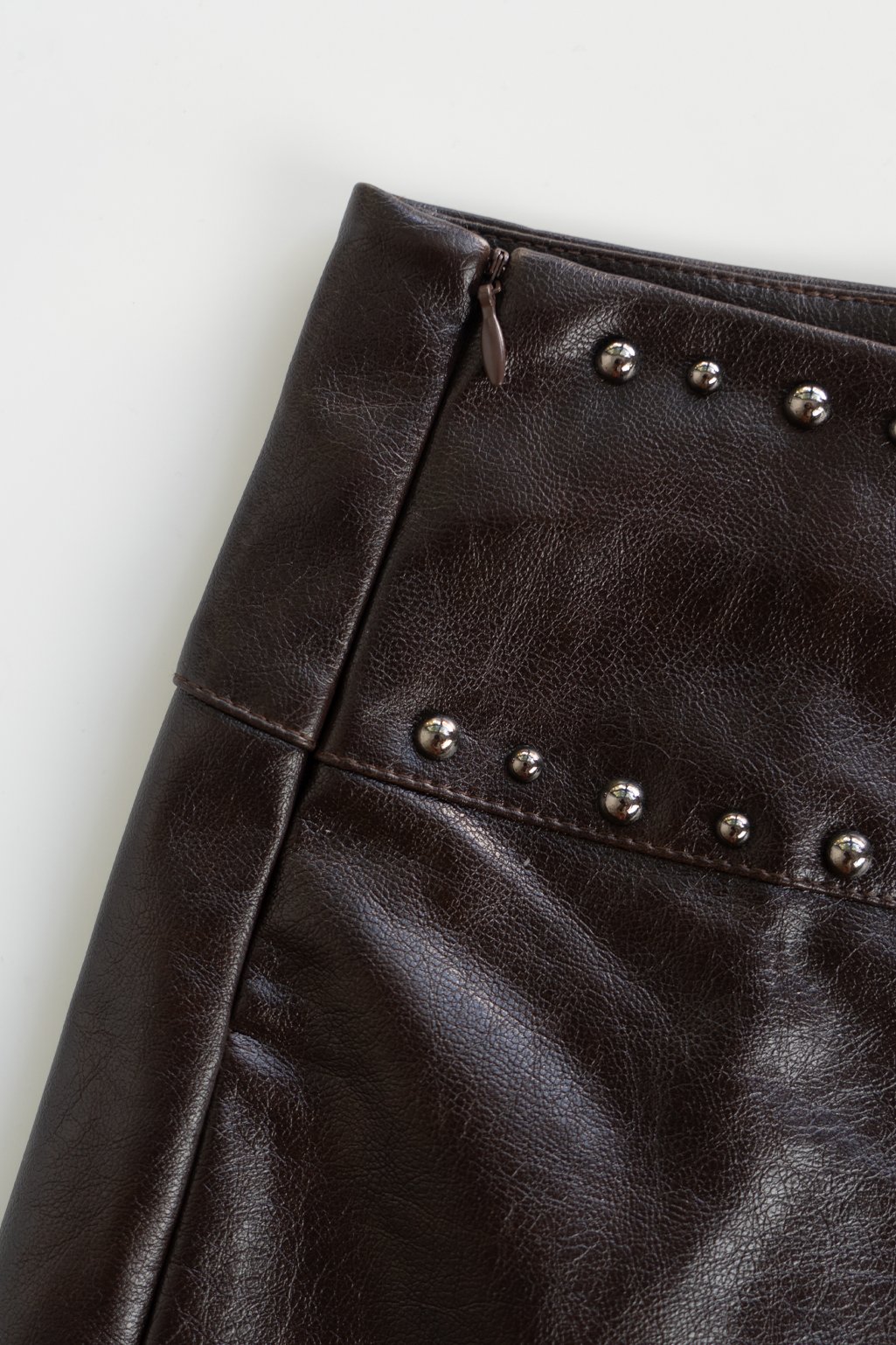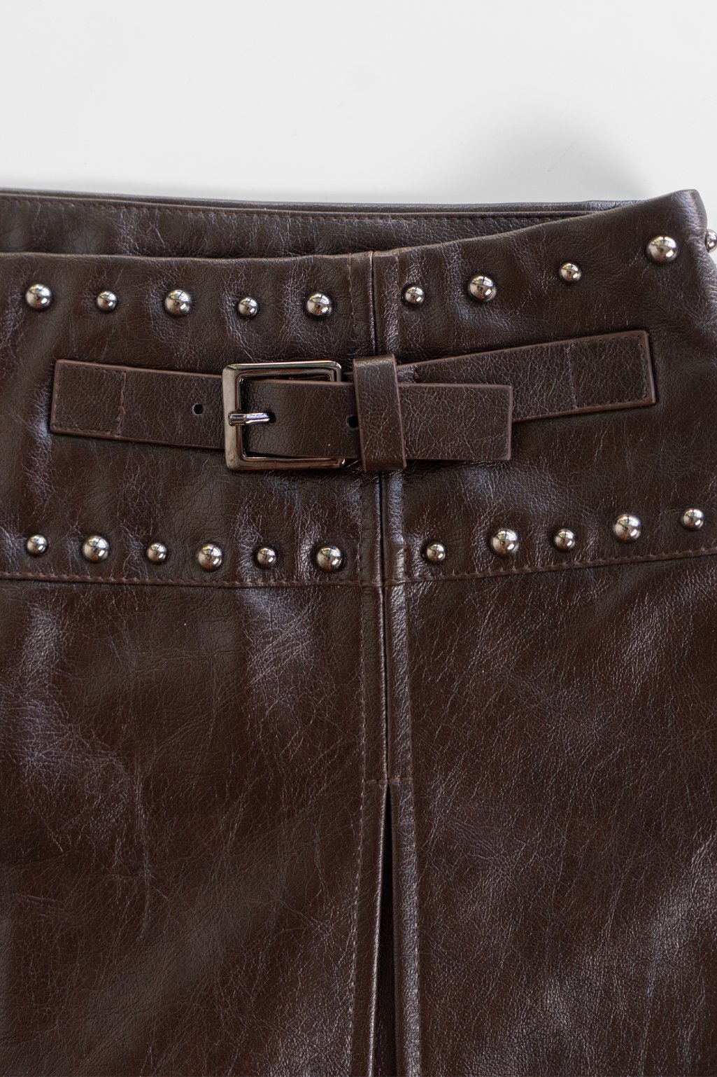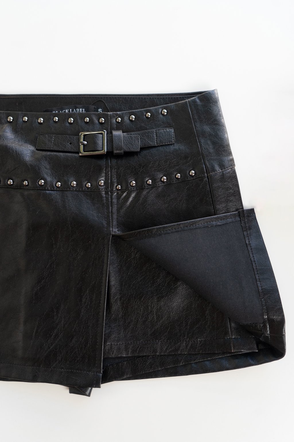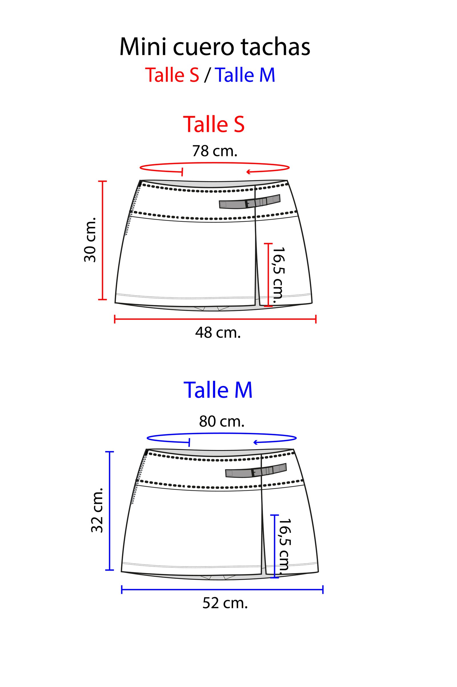 Minifalda de cuero con apliques de tachas y hebilla en la cintura. Acceso por cierre invisible a tono en uno de los laterales. Tiene tajo en el frente y short interno del mismo material Disponible en talle S y M, medidas en la última imagen.