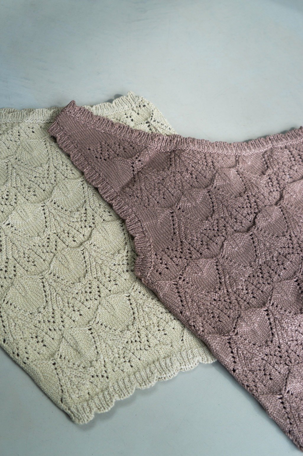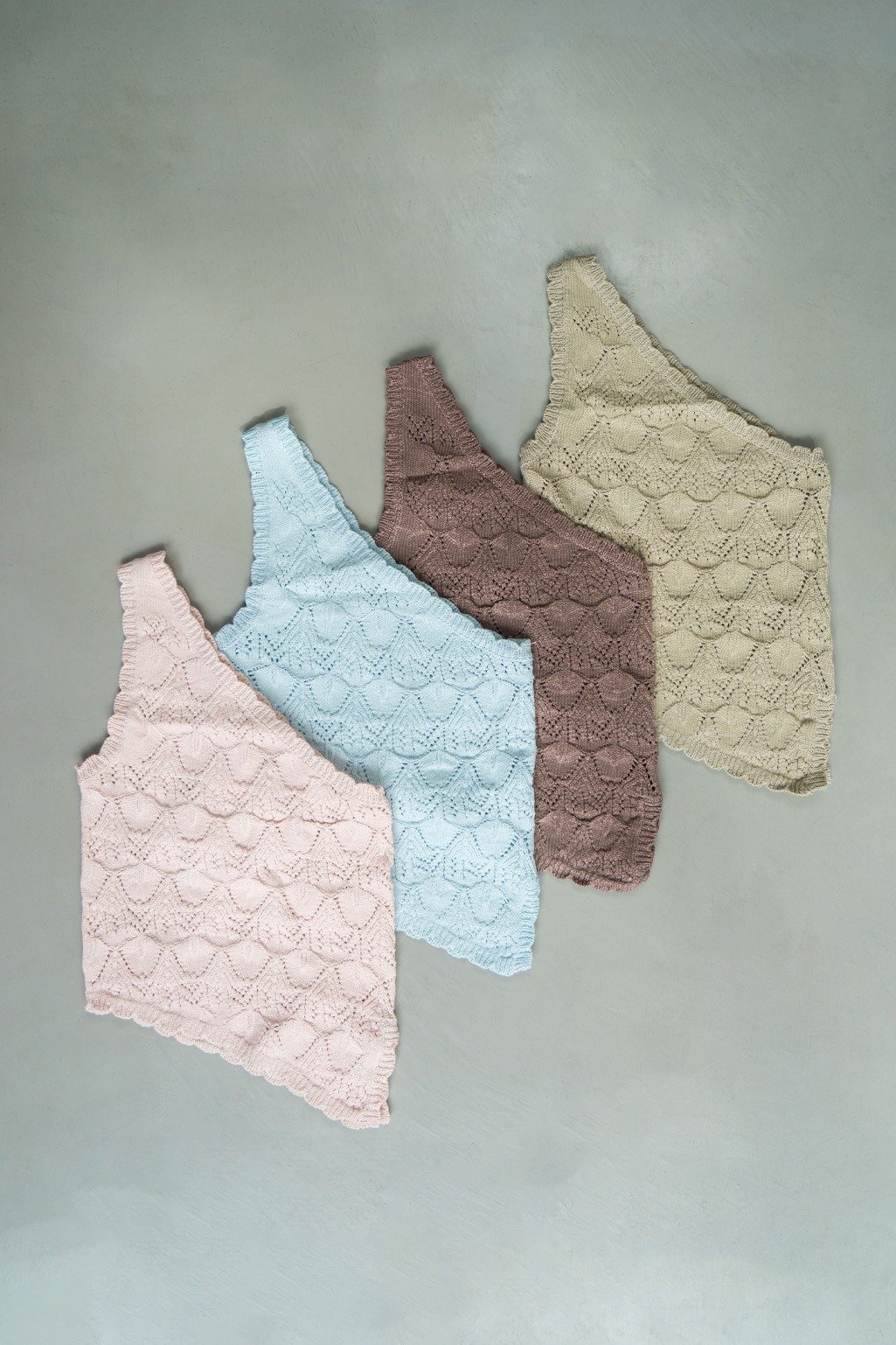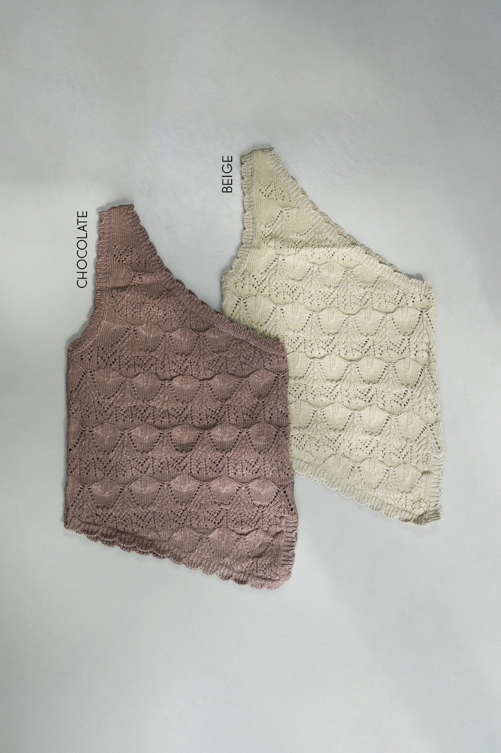 Top tejido con escote a un hombro. La trama de este tejido es única, con terminaciones onduladas, diseñado especialmente para esta prenda. La parte inferior es irregular y termina en pico con un tajo. Medidas en la última imagen.