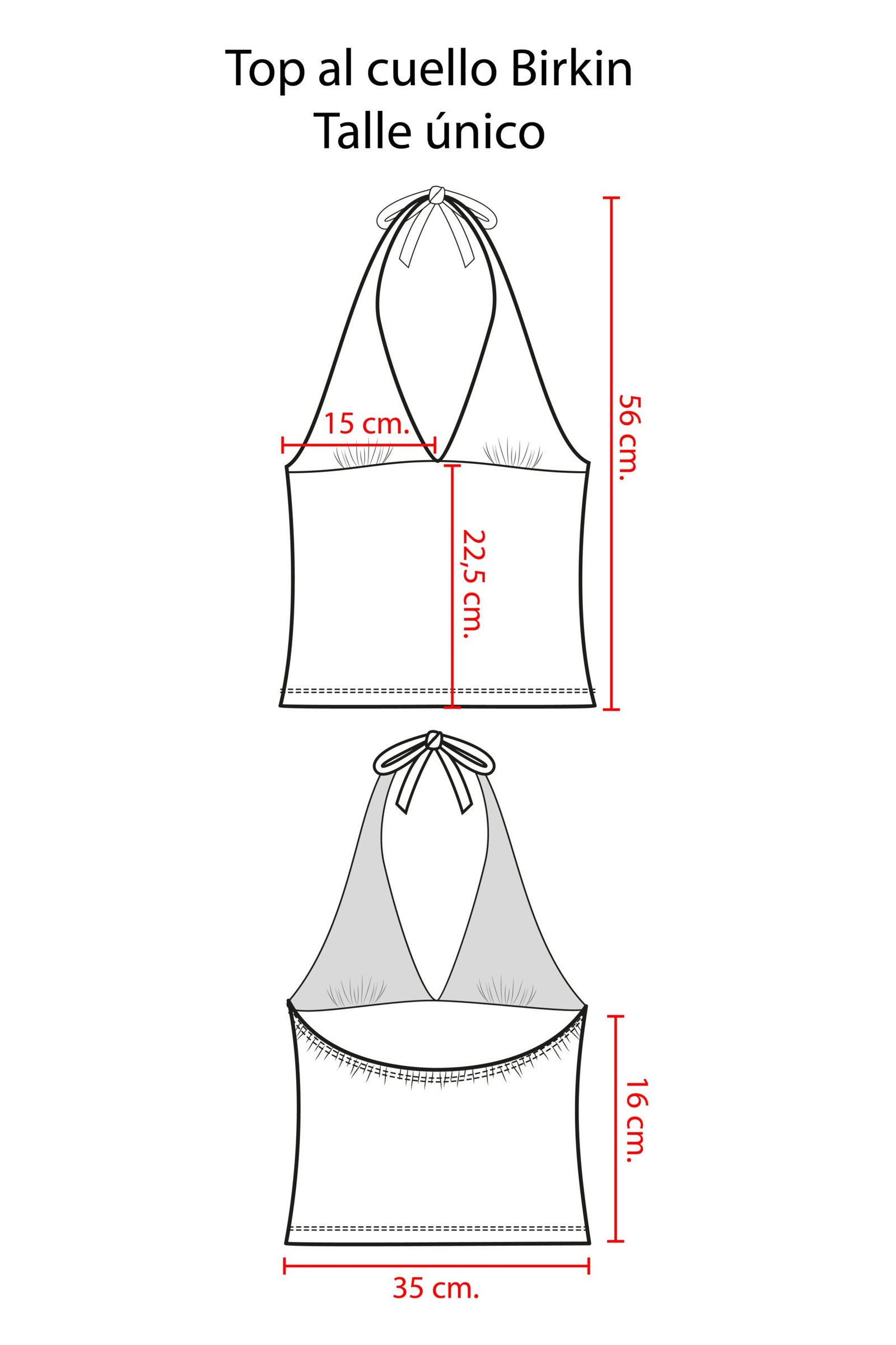 Top escote halter con tiras para atar en el cuello. Tiene forrería de morley a tono en la parte del busto y elástico en la espalda para más comodidad! Arma el set perfecto con el pantalón birkin 🙂 Talle único, medidas en la última imagen.