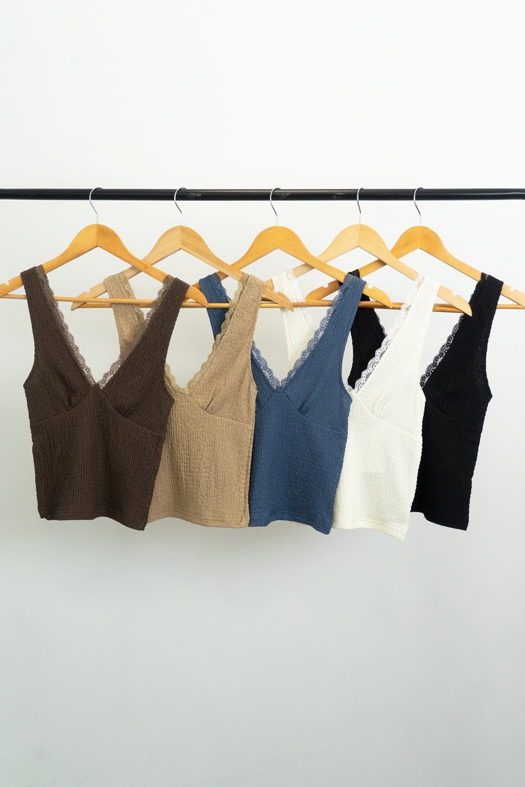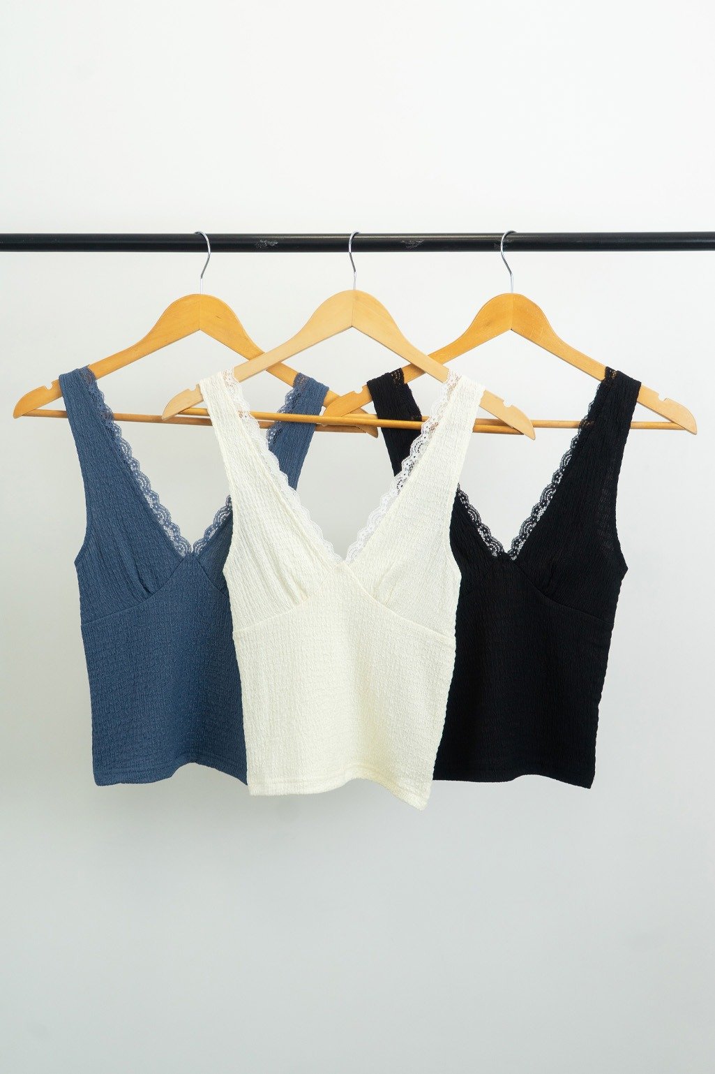 Top de bambula con textura, tiene detalle de encaje a tono en el escote. Combinalo con el pantalón bambula Capri y arma el set ideal para la temporada ❤️ Talle único, medidas en la última imagen.