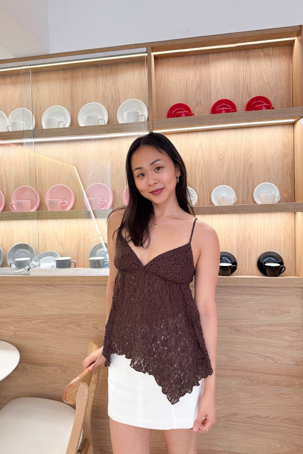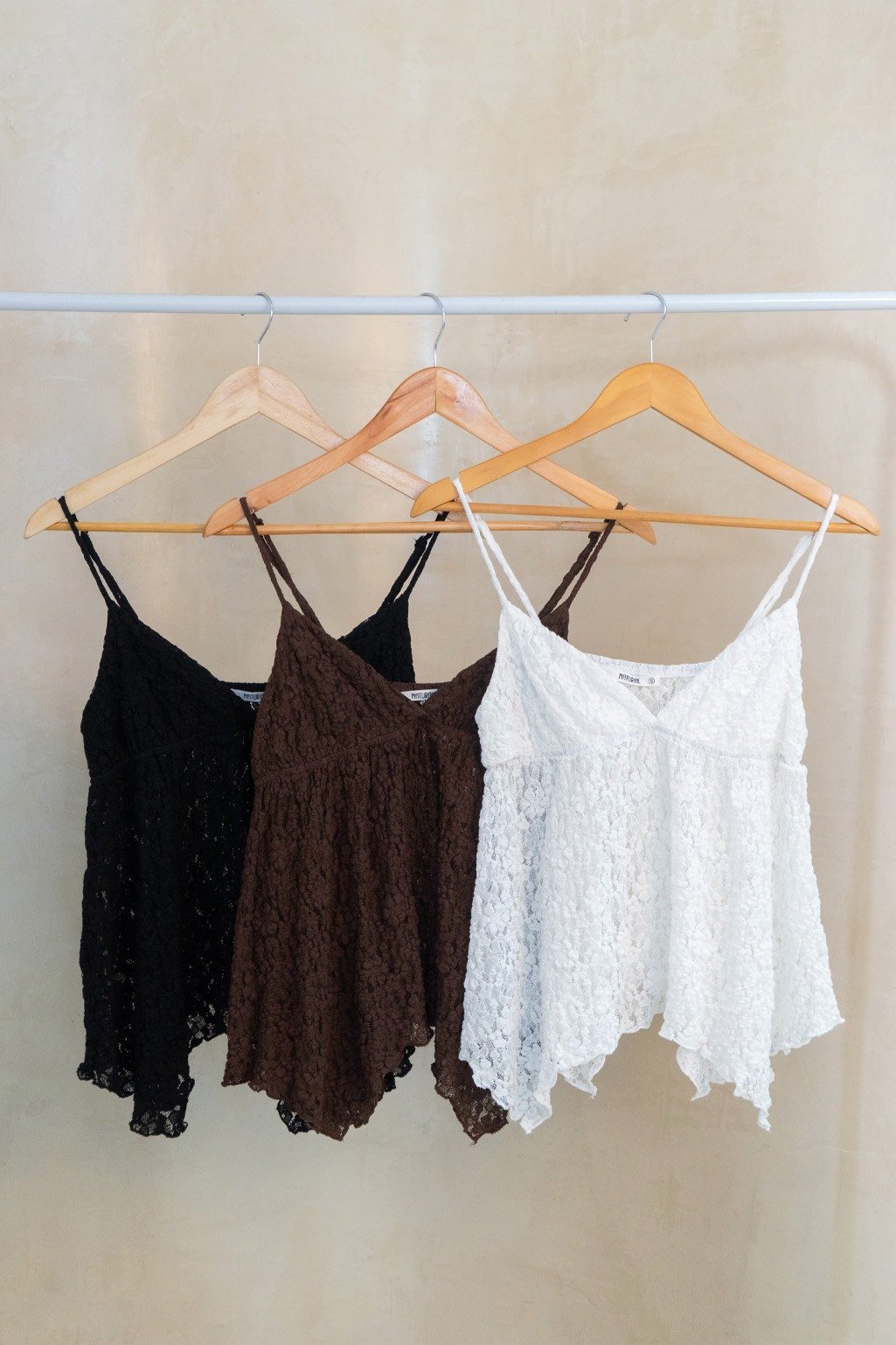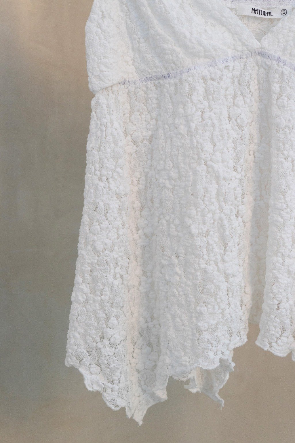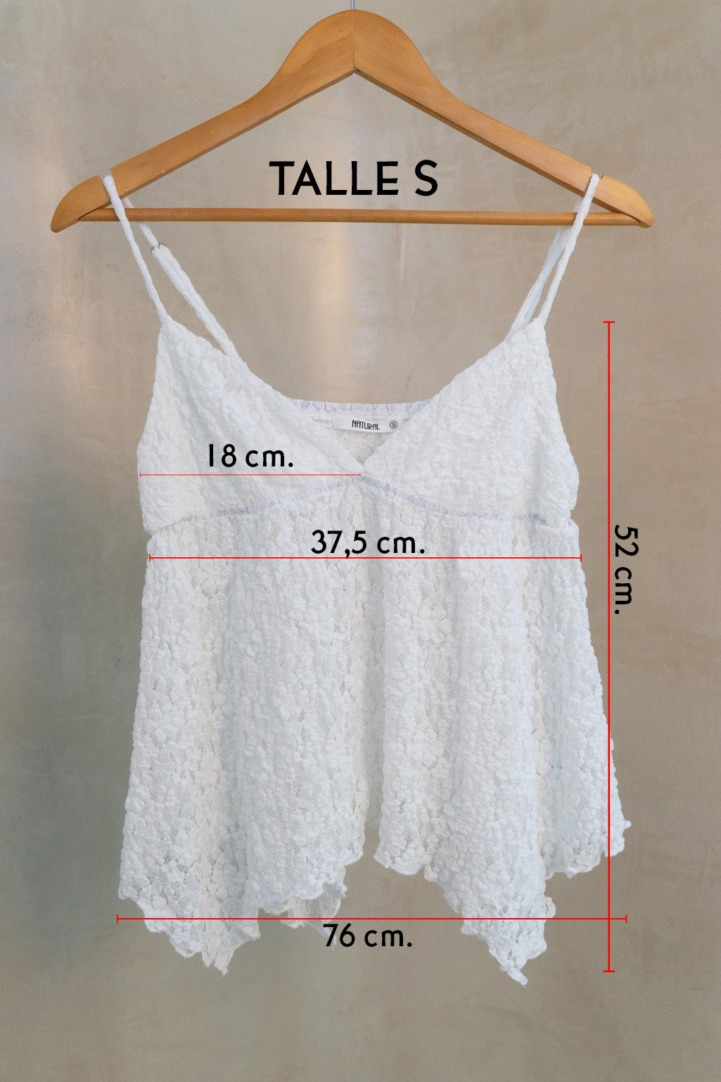 Top confeccionado en textil de encaje con relieve, terminación asimétrica en picos. Tiene tiras regulables y doble tela en el busto para más comodidad ❤️ Disponible en talle S y M, medidas en la última imagen.