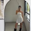 Vestido corto de microfibra con aplique en el escote. La parte superior es al cuerpo con frunces en los laterales, terminación en falda con vuelo ✨ Talle único.