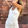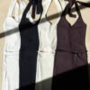 Vestido tejido corto. Tiene escote halter con tiras para atar en el cuello, lo que hace que lo puedas regular a tu gusto! El detalle de cinturón con el avío dorado lo hace perfecto para usar tanto para el día como para la noche 🙂 Talle único, medidas en la última imagen.